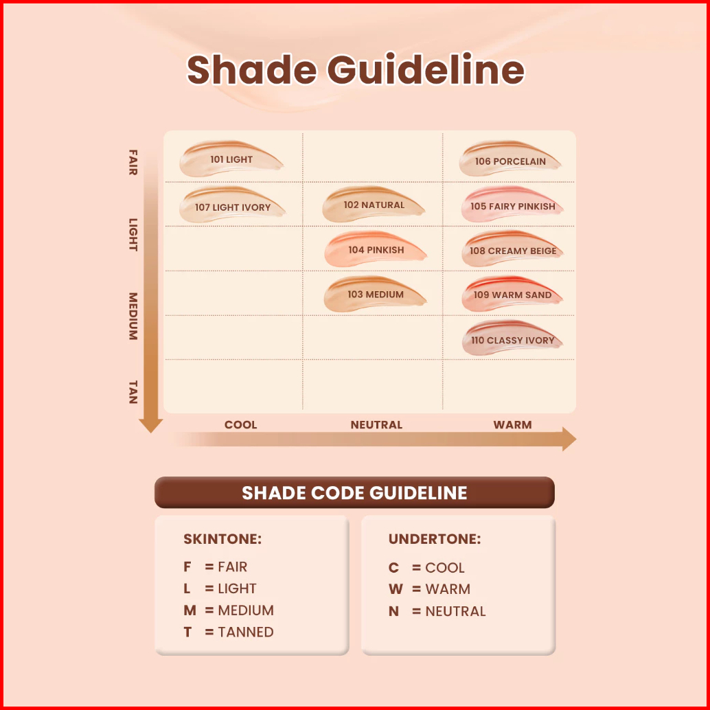 101/Light, 102/Natural, 103/Medium, 104/Pinkish, 105/Fairy Pinkish, 106/Porcelain, 107/Light Ivory, 108/Creamy Beige, 109/Warm Sand, 110/Classy Ivory