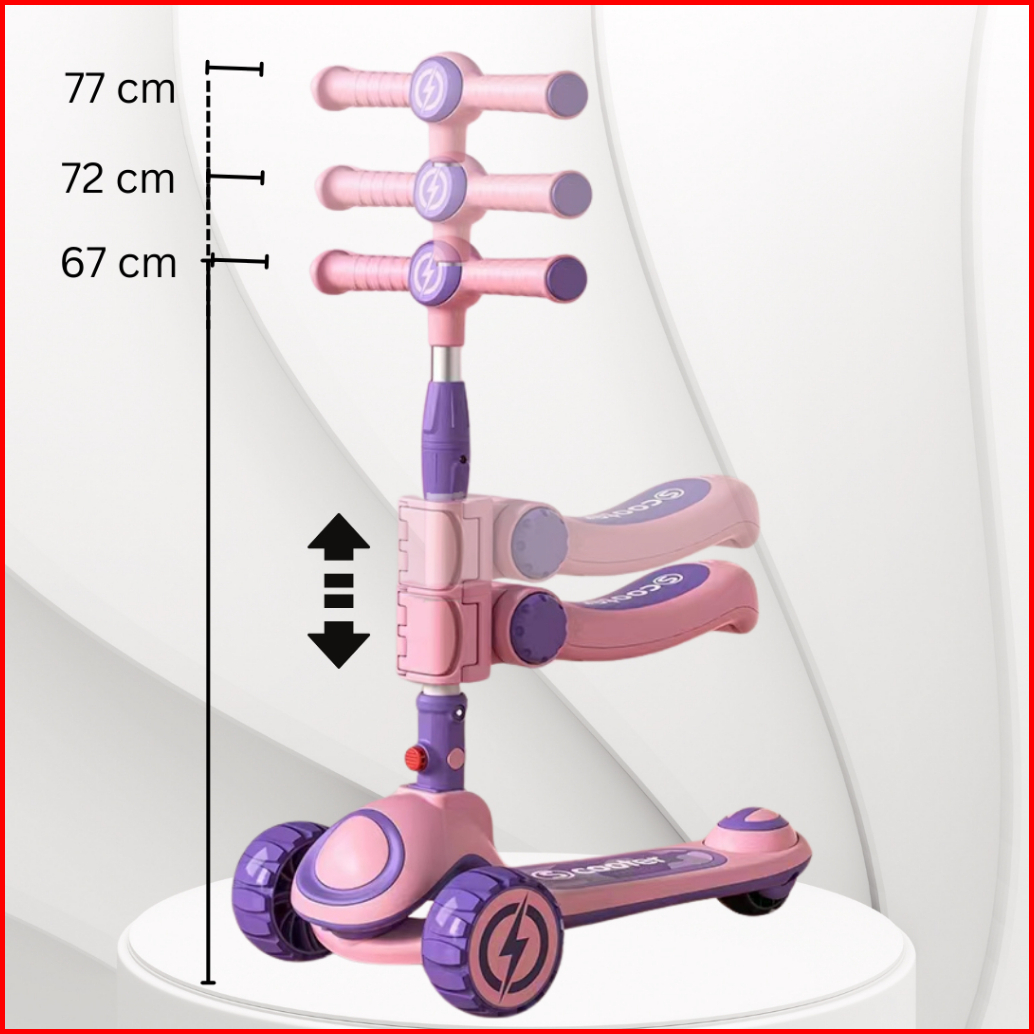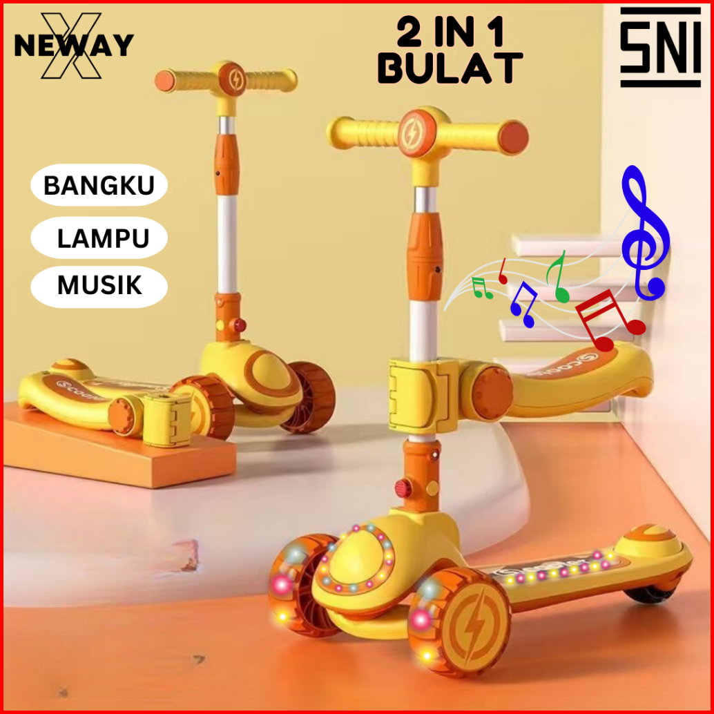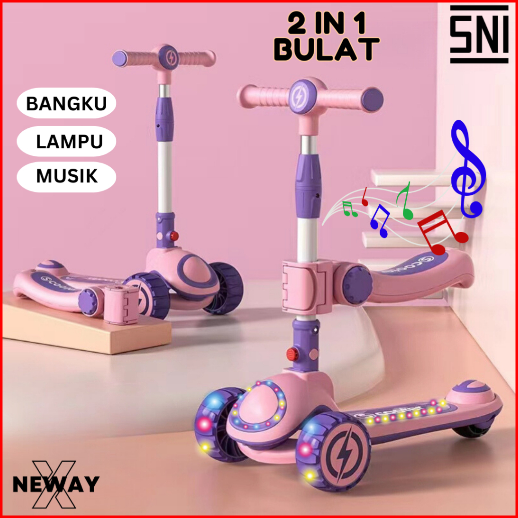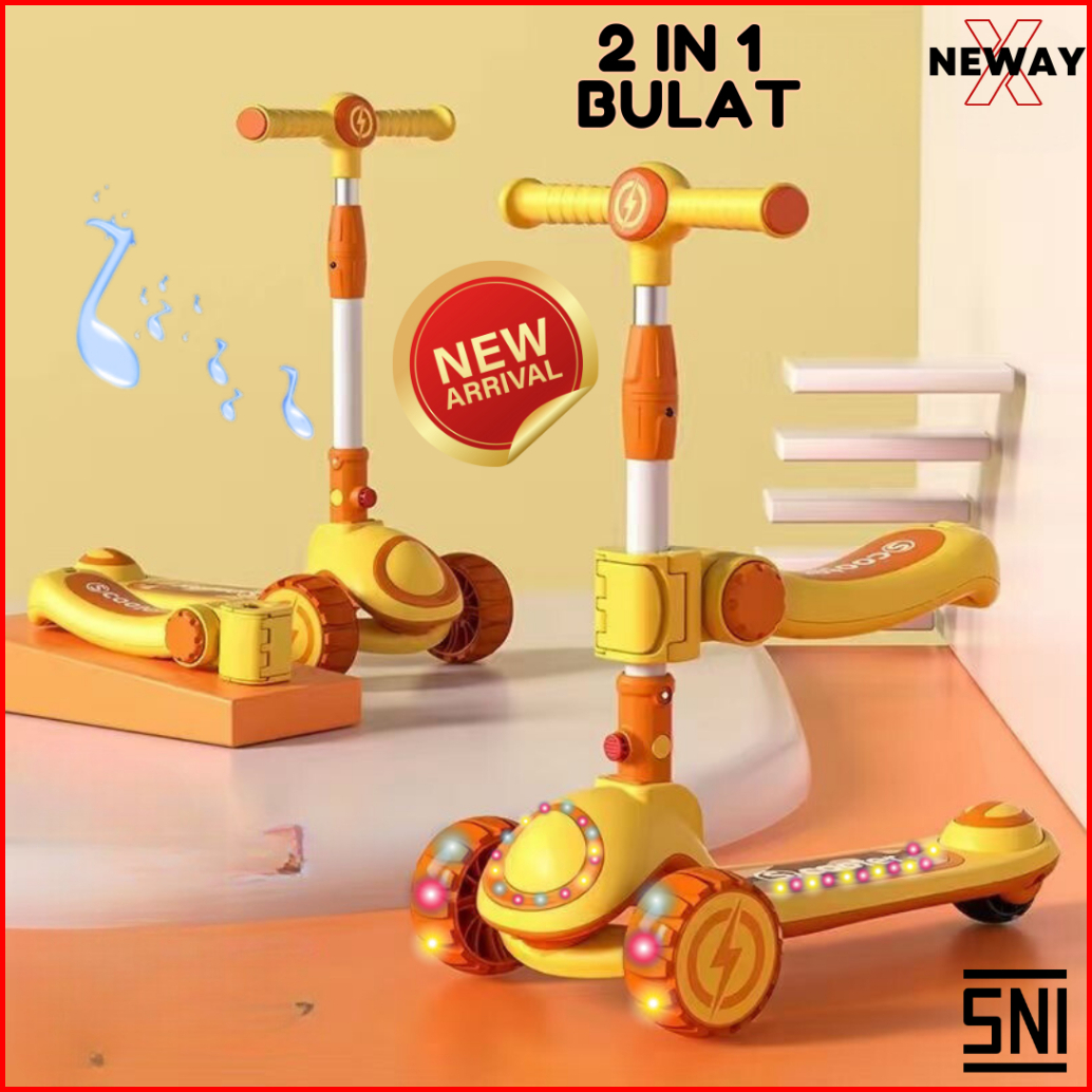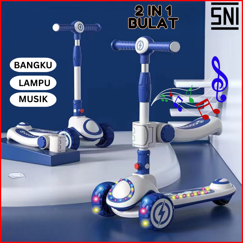 Scooter Mainan Anak Bulat 2 In 1 Skuter Lipat Duduk Roda Tiga Otoped Lampu Musik Rem Anak Toys