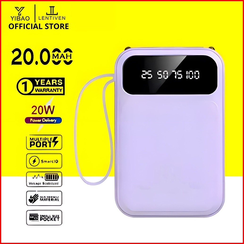 Yibao Lentiven Powerbank 20000 Mah Mini Size Fast Charging With Kabel Data Type C Micro Usb B7