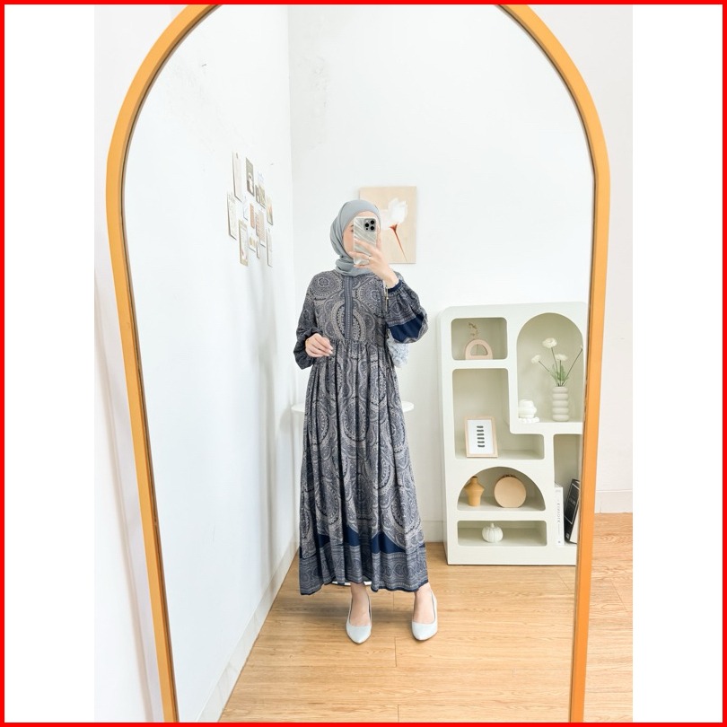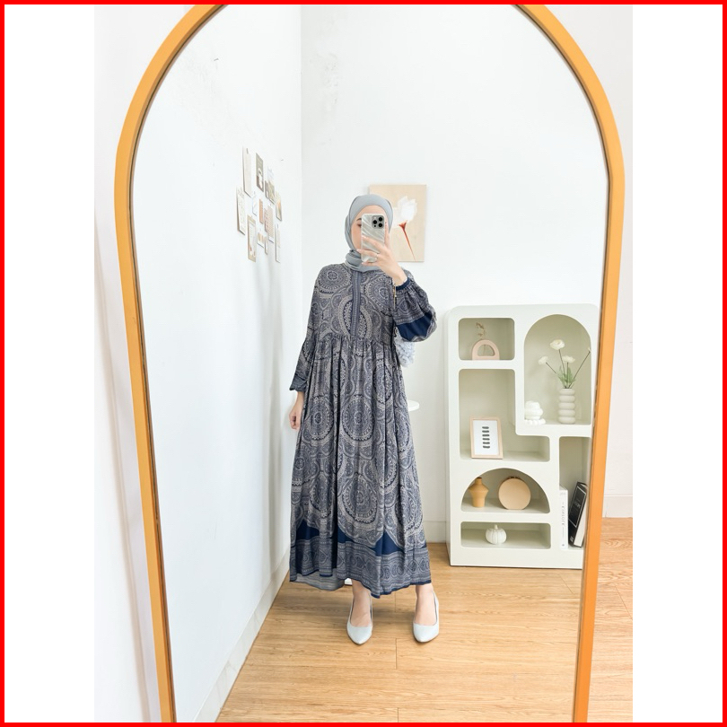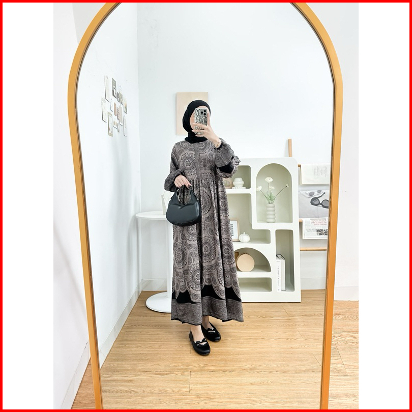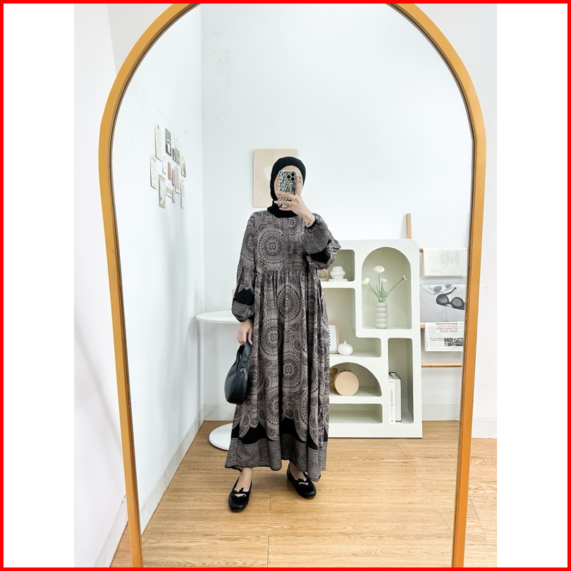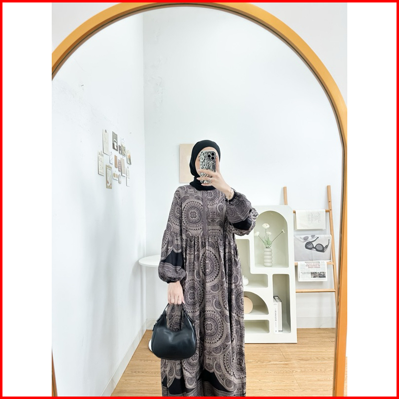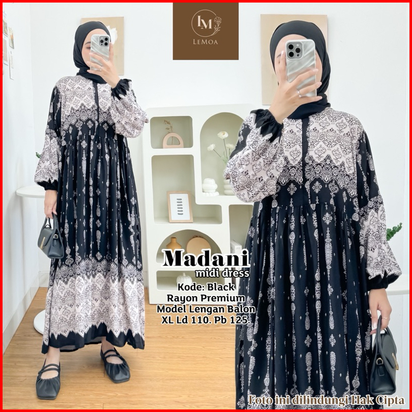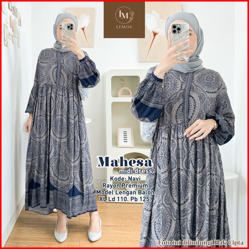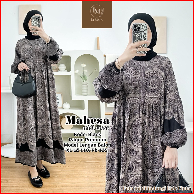 Mahesa Midi Dress Motif Bunga Lengan Balon By Lemoa Bahan Rayon Premium Baju Panjang Wanita Daster Busui Adem Flowy Fit