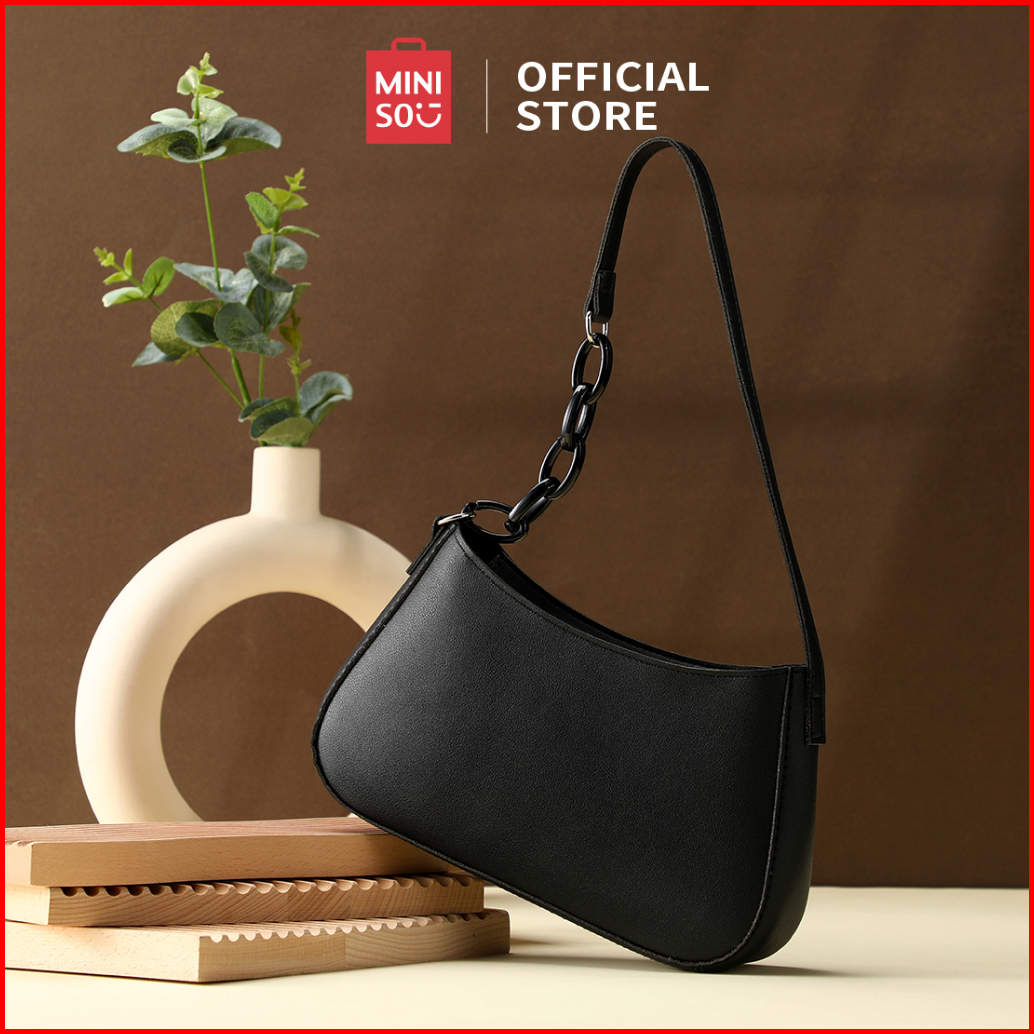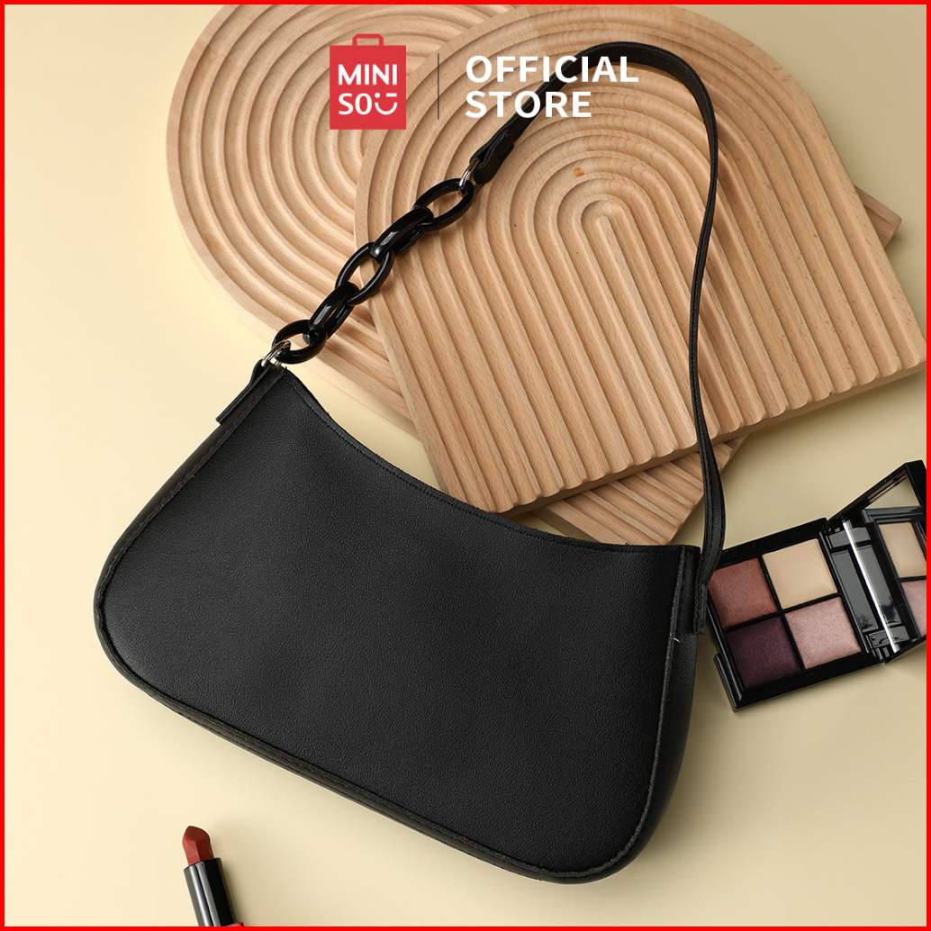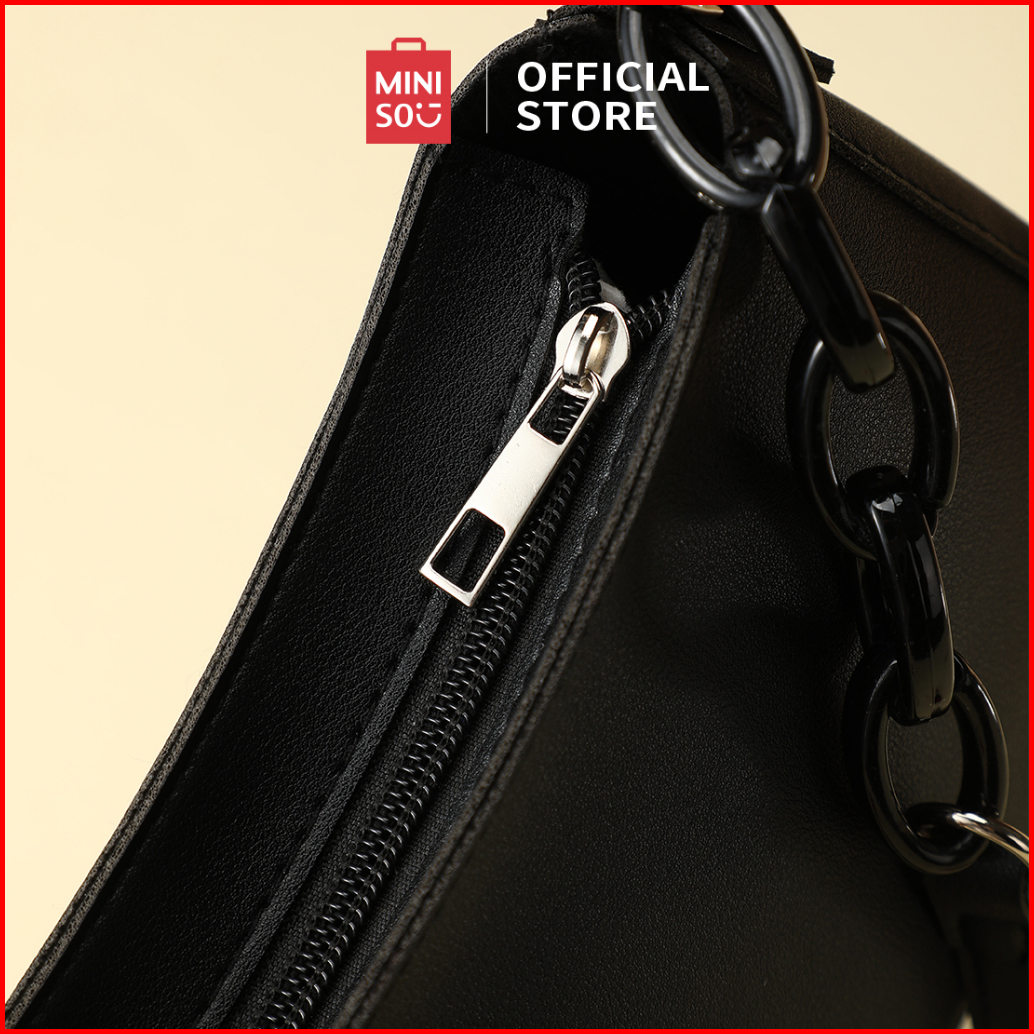Miniso Tas Wanita Hitam Shoulder Bags Tas Pundak Ritsleting Tali Rantai Fashion Muda Kapasitas Tinggi