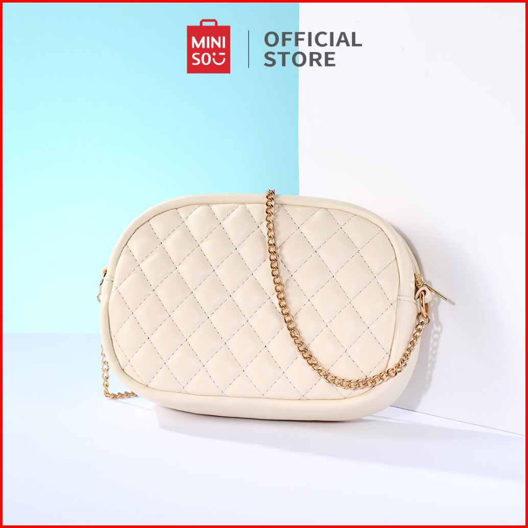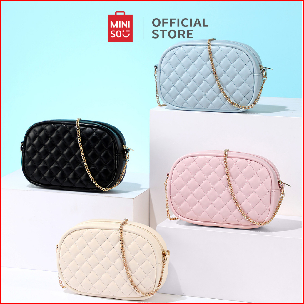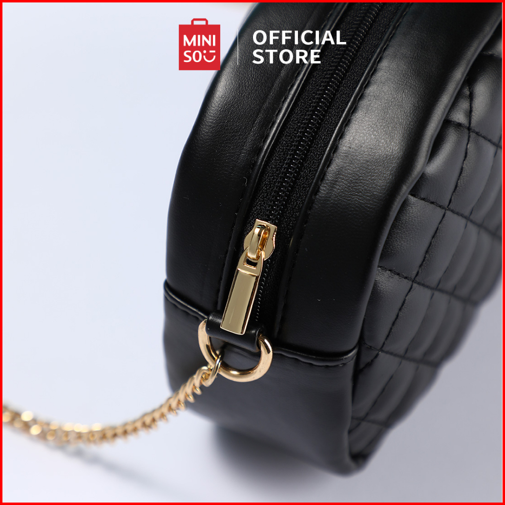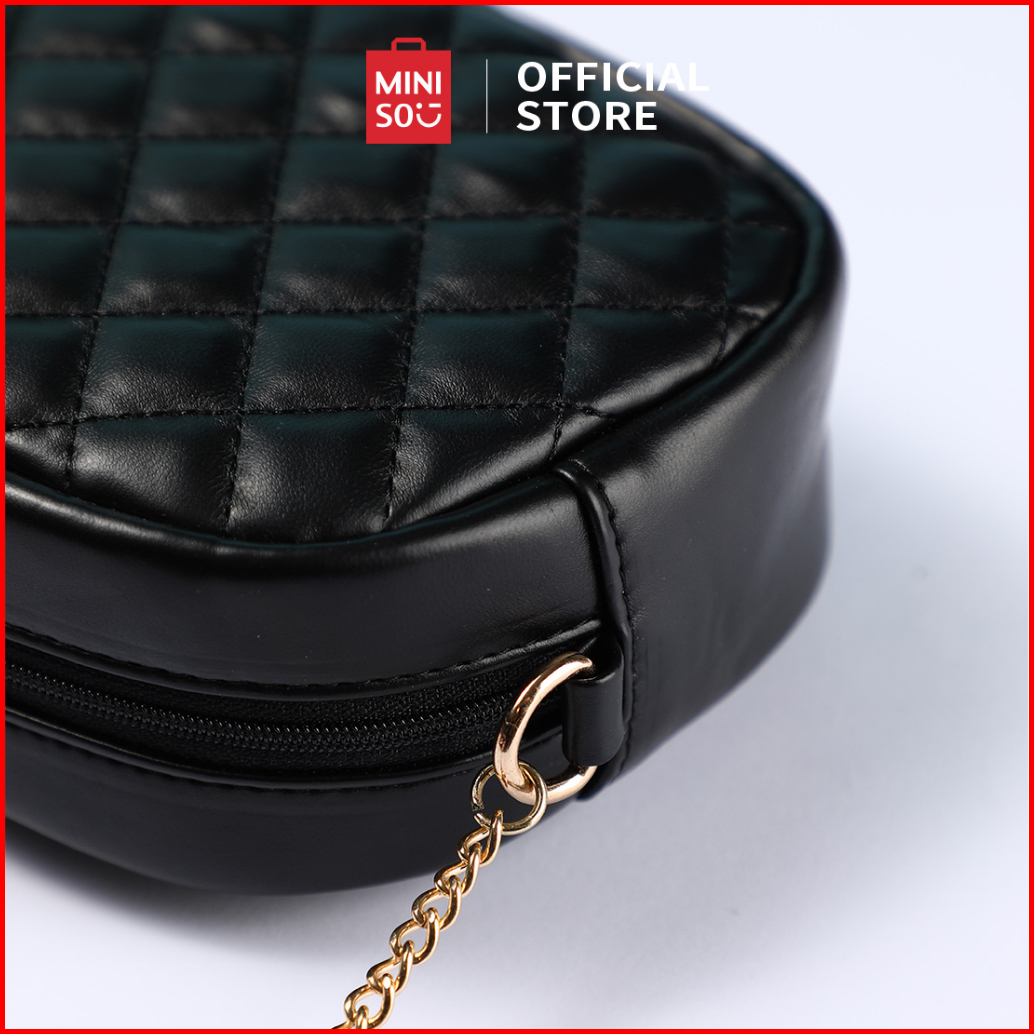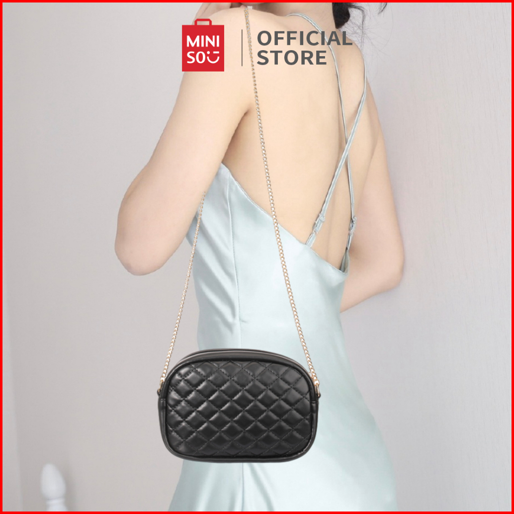 Miniso Tas Selempang Tas Wanita Hitam Dengan Rantai Pola Kisi Berlian Berlapis Pu Kain Lembut Kapasitas Tinggi