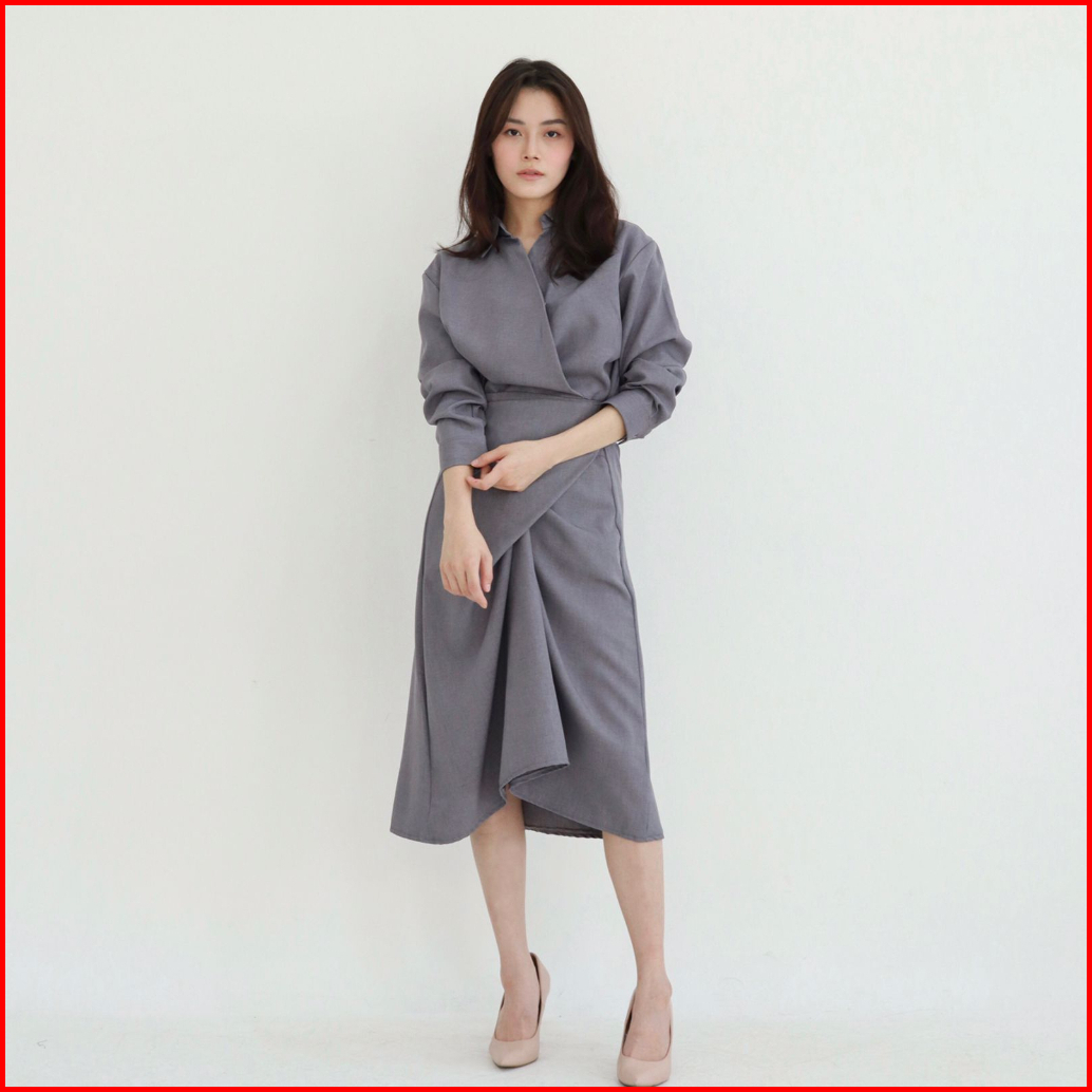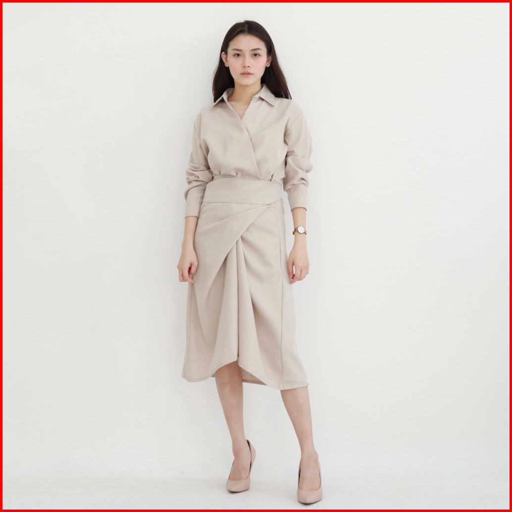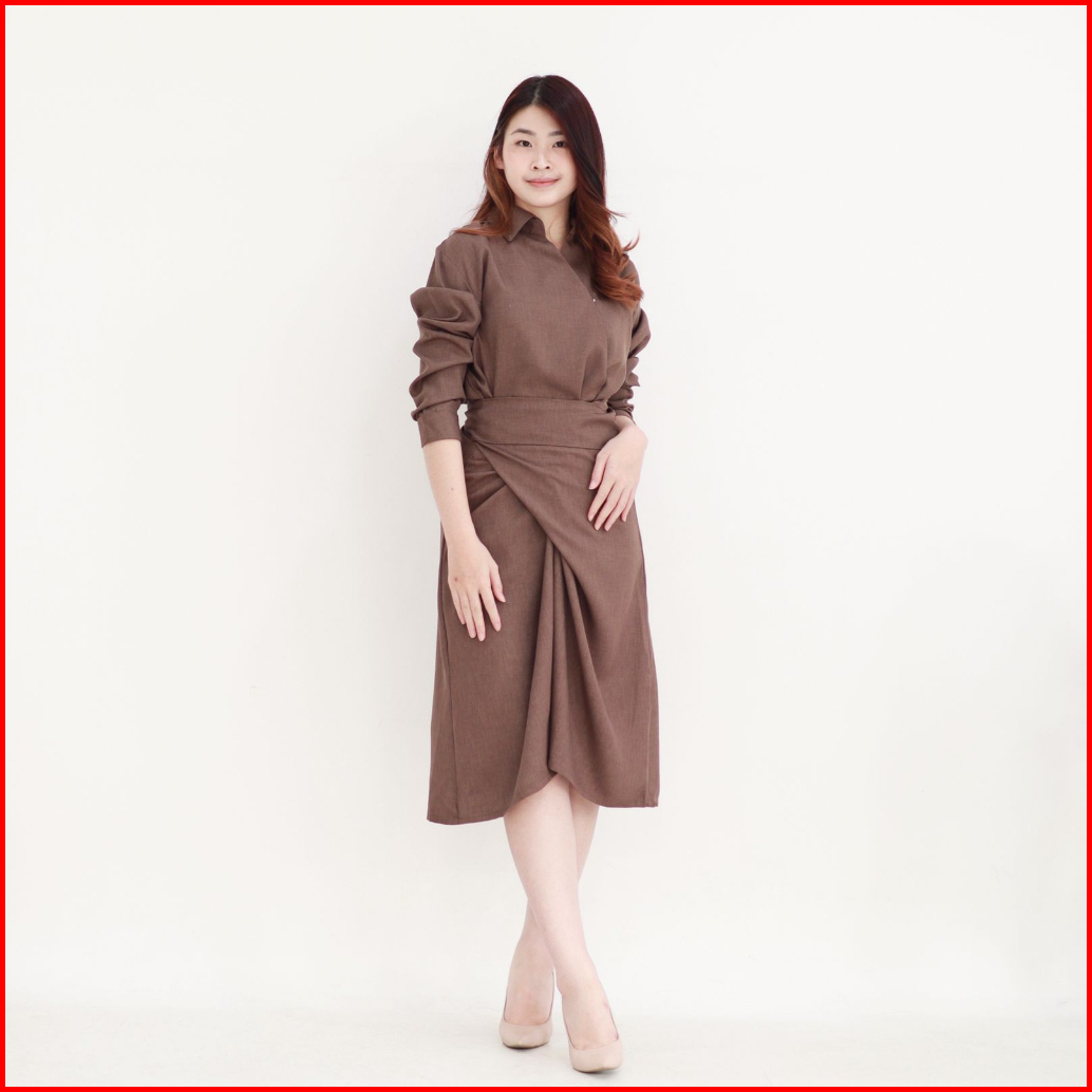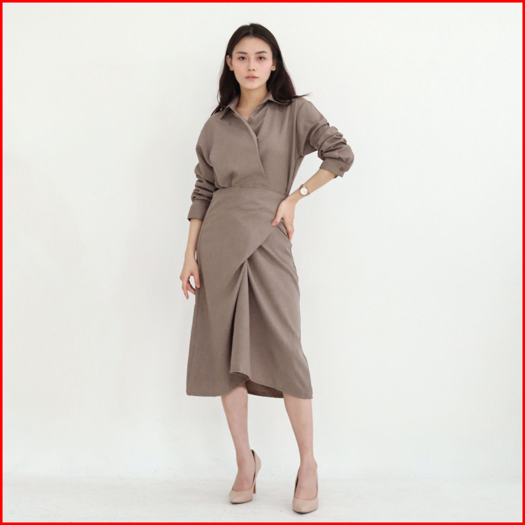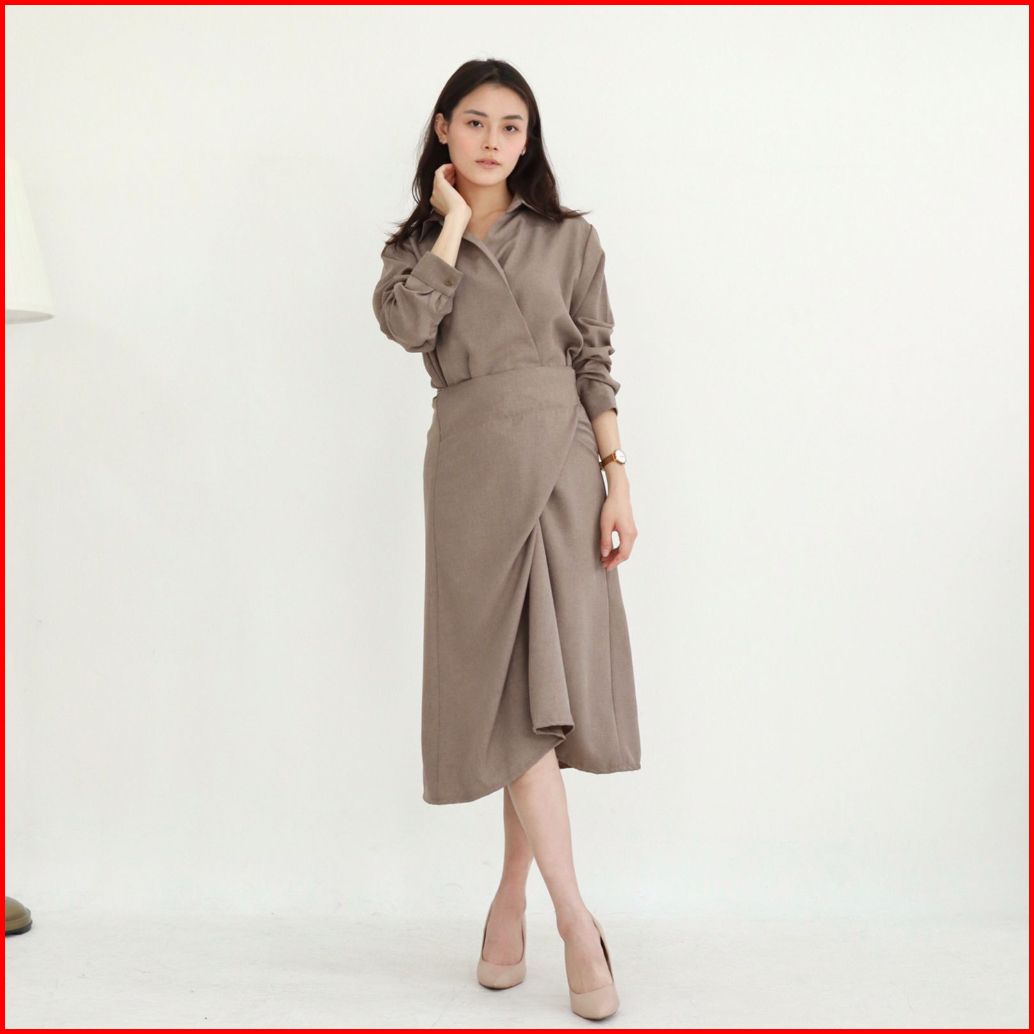 Msmo Clay Wrap Skirt Shirt Dress Dress Wanita Dress Casual Midi V-neck