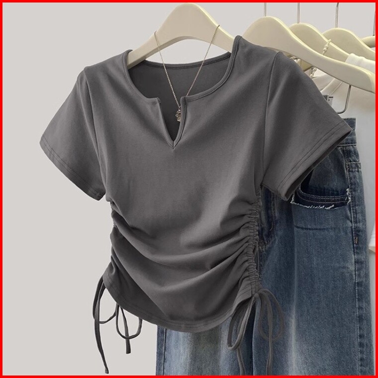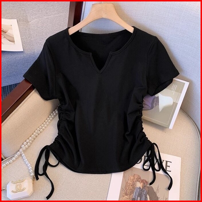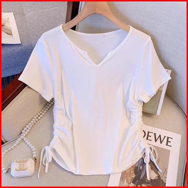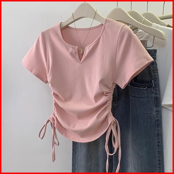 T-shirt Lengan Pendek Kerah V Bertali Merah Muda
