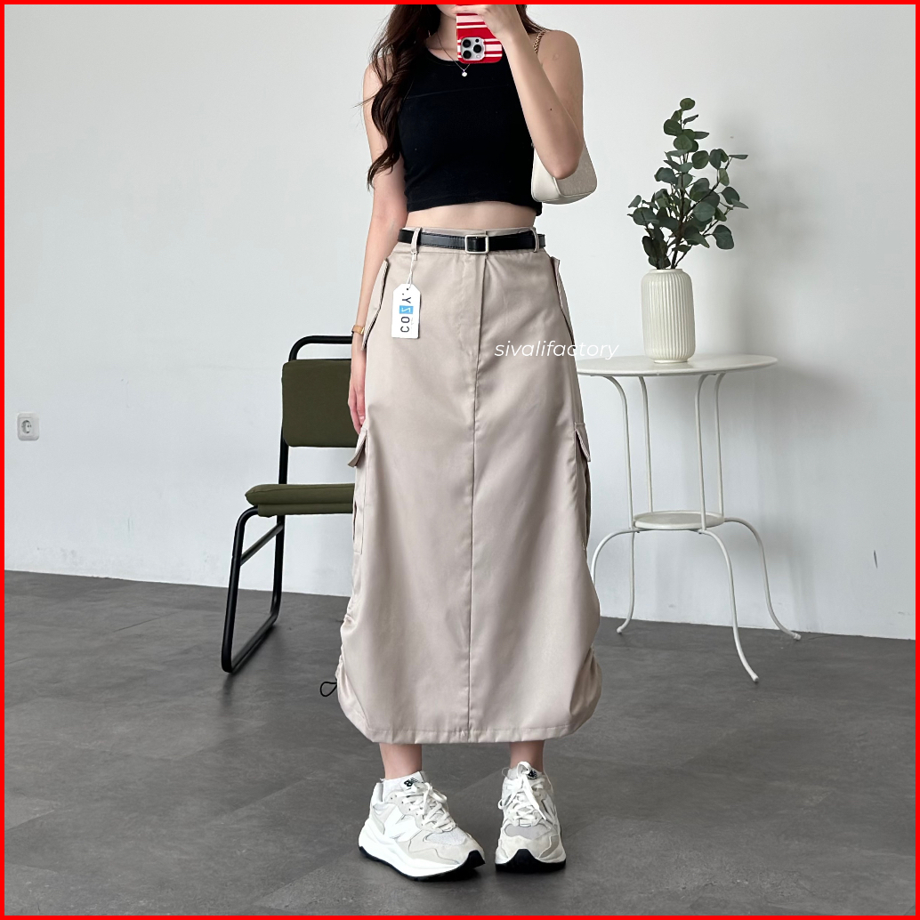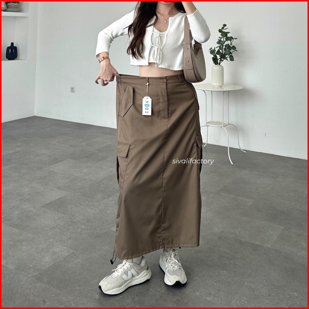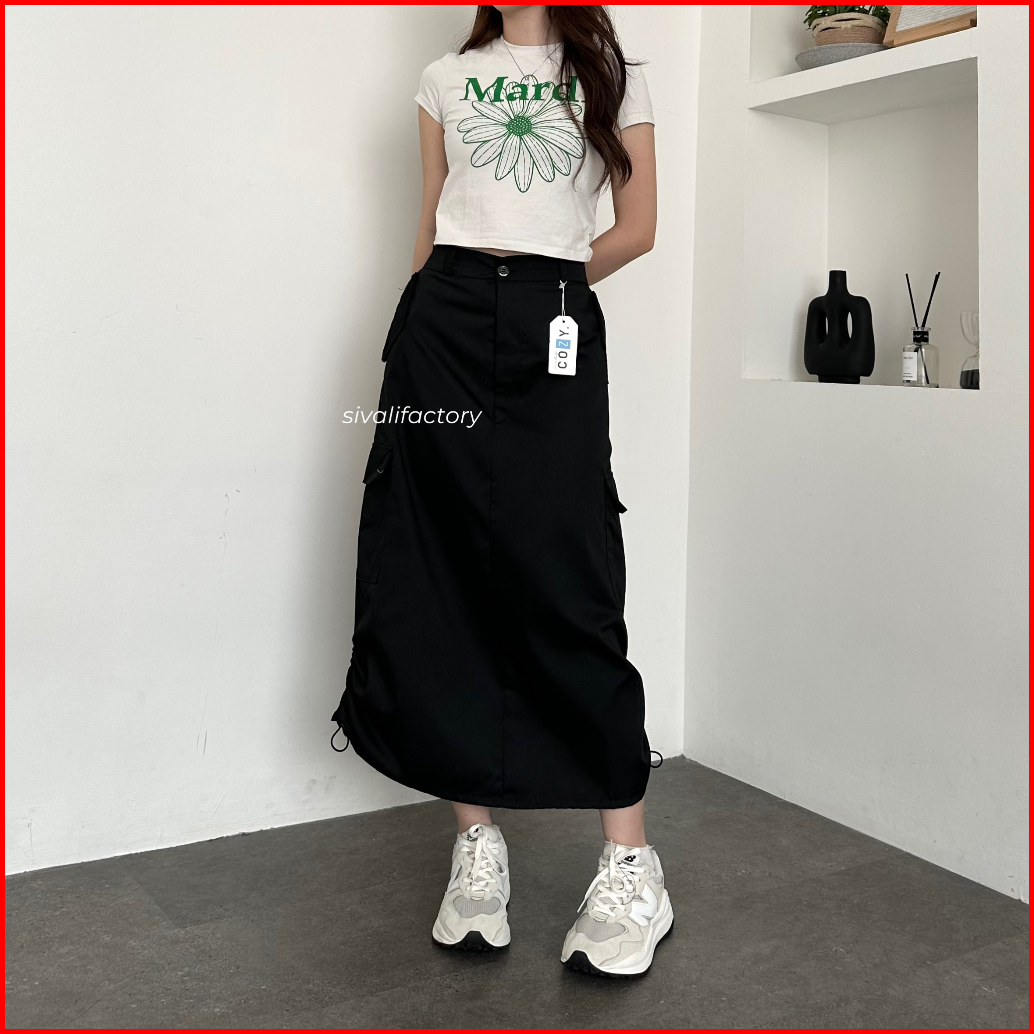 Sivali Taylor Cargo Skirt - Rok Kargo Serut Wanita Pocket Long Skirt Maxi Panjang