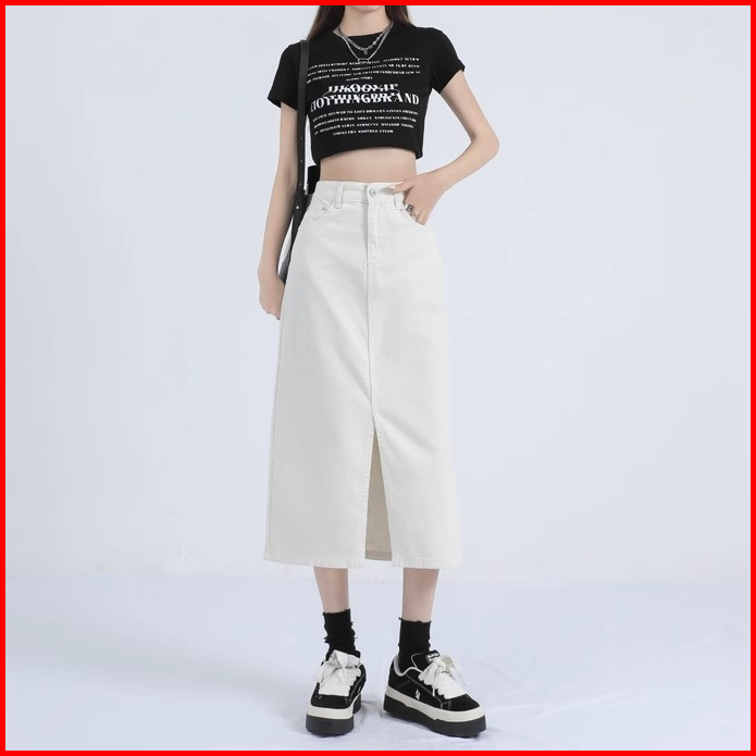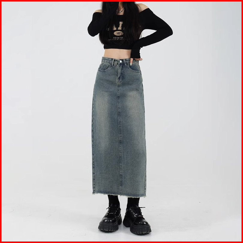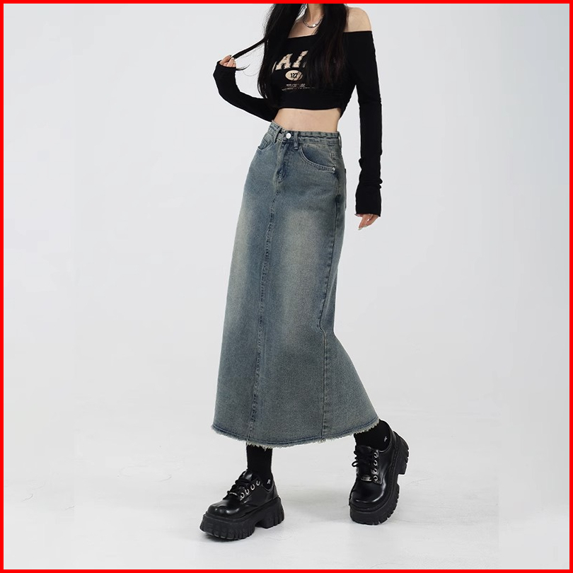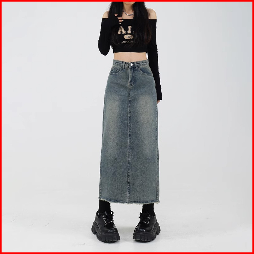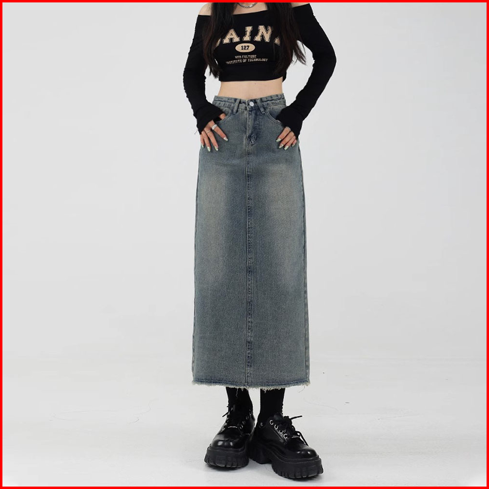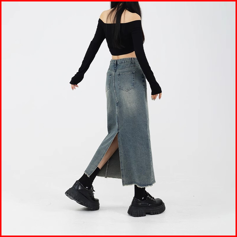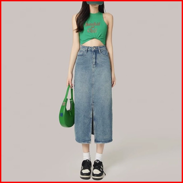 Penawaran Istimewa Biru Highwaist Rok Jeans A-line Split Kasual Rok Midi Rawis