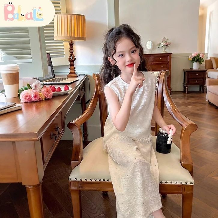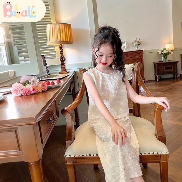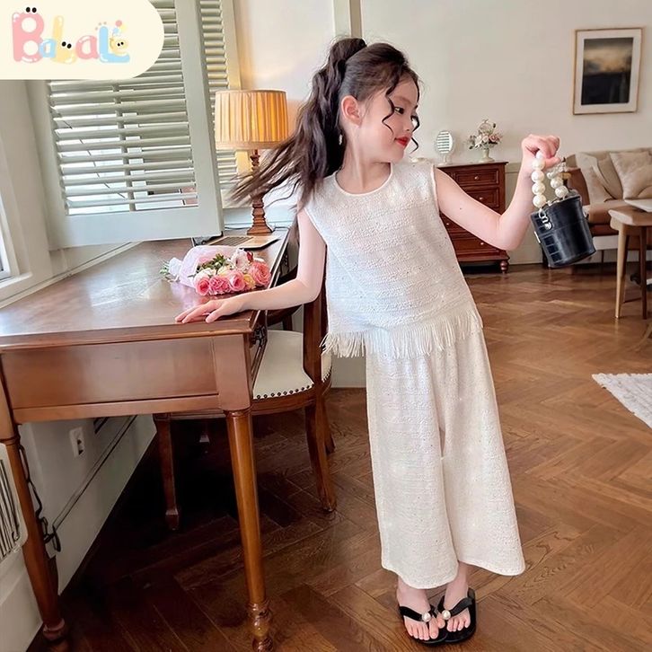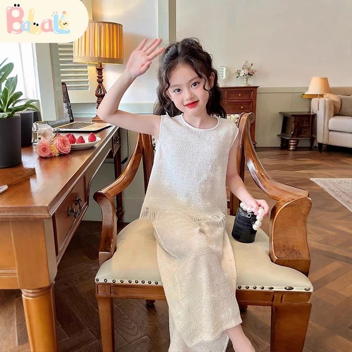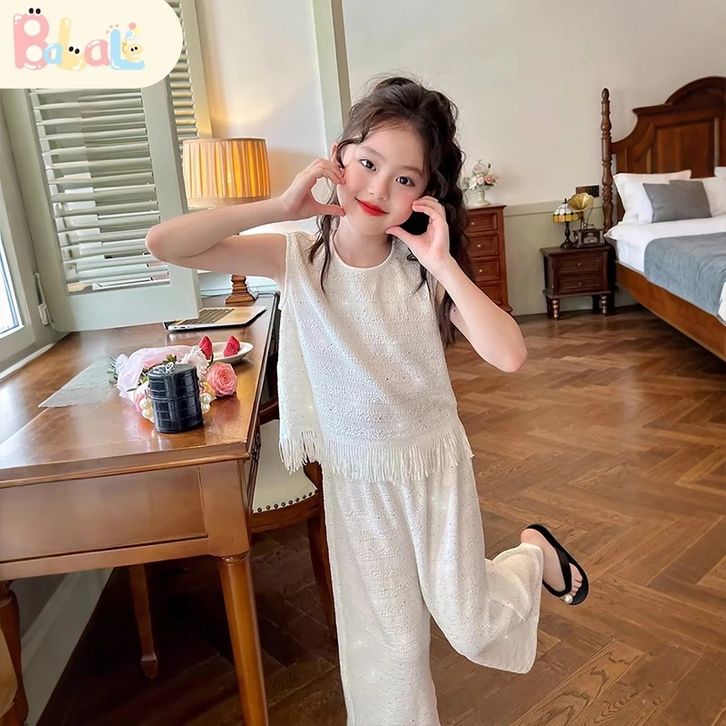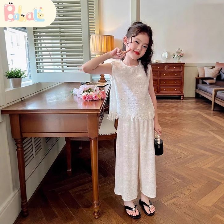 OOTD Fashion Anak Perempuan Korean Style Setelan Bergaya Tanpa Lengan Desain Rumbai Bernapas