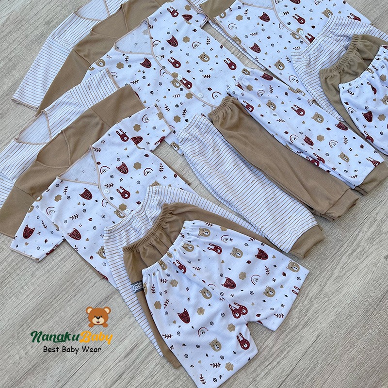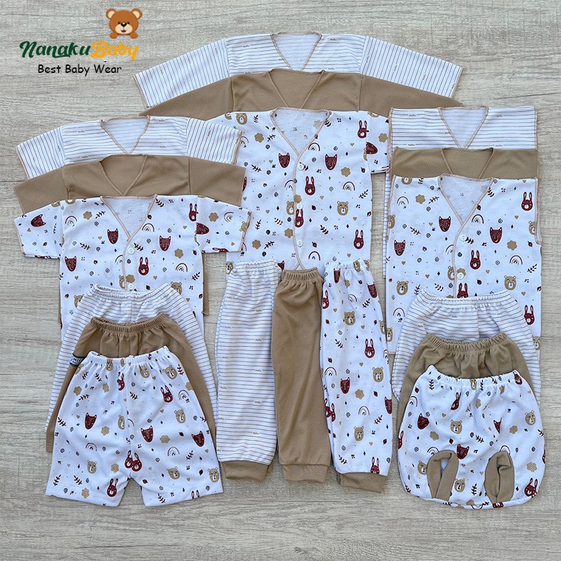 Nanaku Baby - Set Paket Newborn Isi 18 PCS/Paket Brojol Setelan Baju Celana Bayi Motif Unisex Warna Mocca Usia 0-3 Bulan