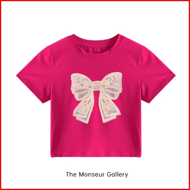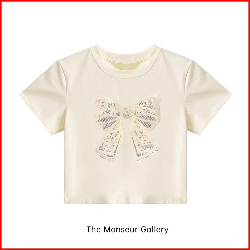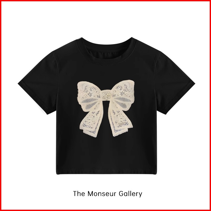 The Monseur Gallery Kaos Crop Wanita Slimfit Pearl Bow Baju Croptee Hitam Korea