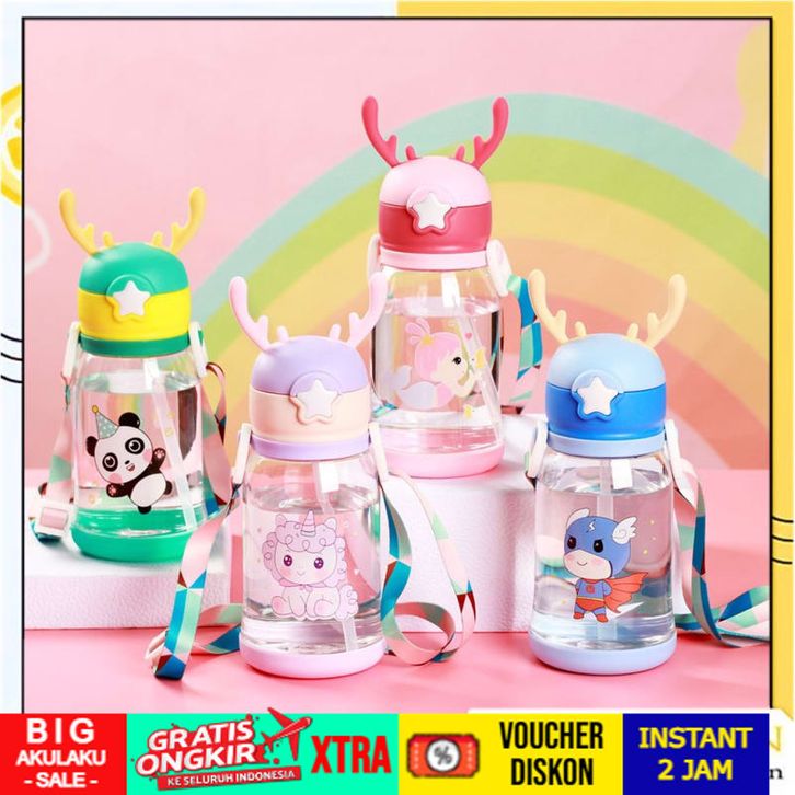 HC Botol Minum Anak Karakter Kartun Botol Air Minum Anak Sedotan 610ml Model Tanduk Rusa Lucu Free Tali Panjang Dan