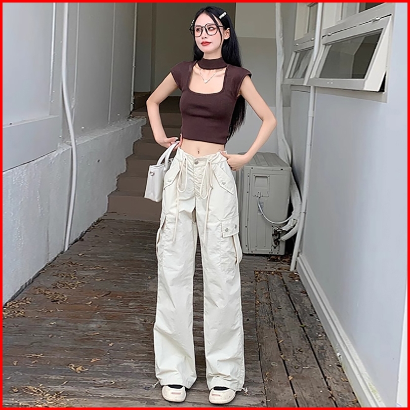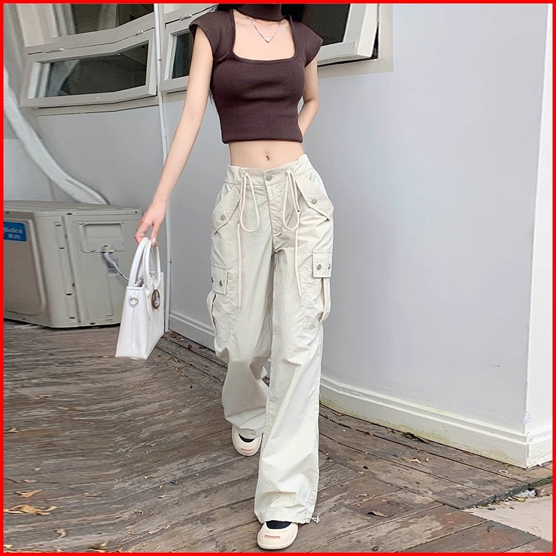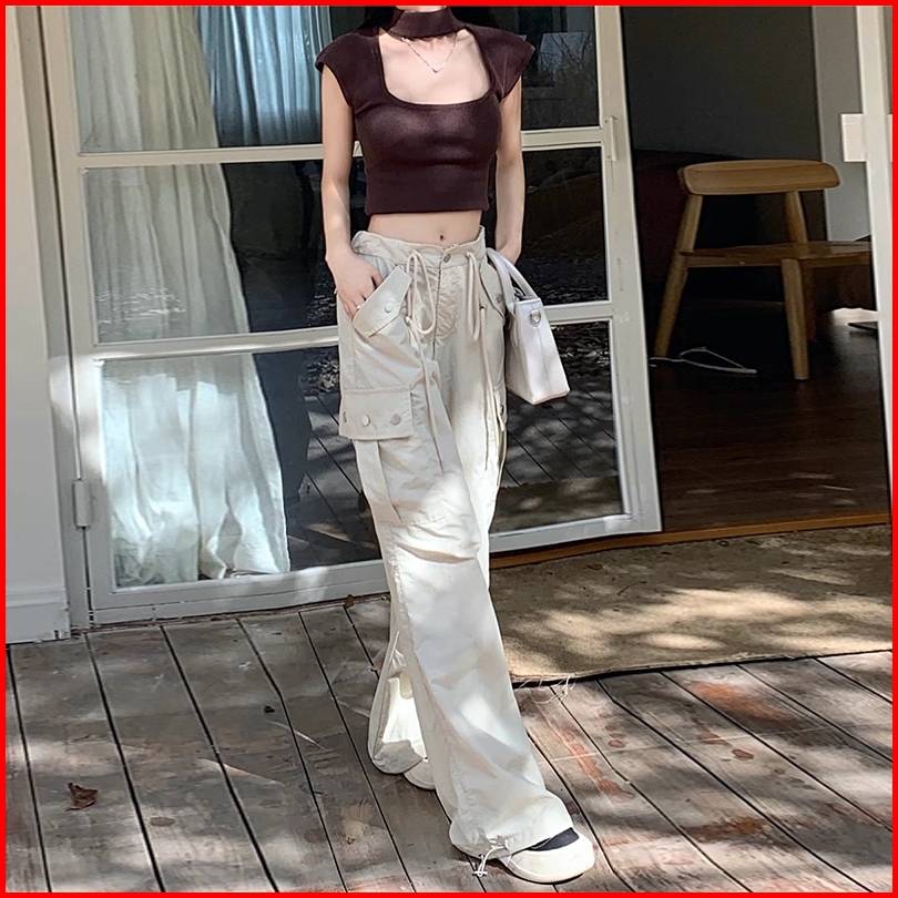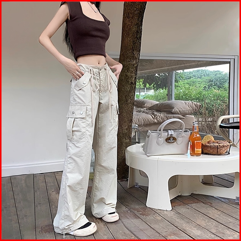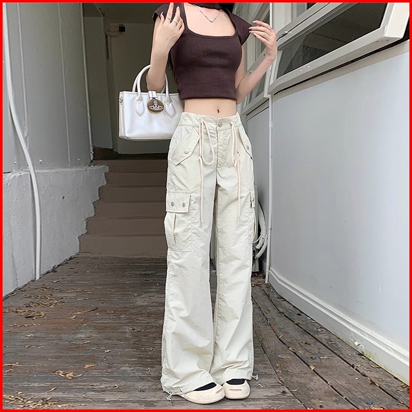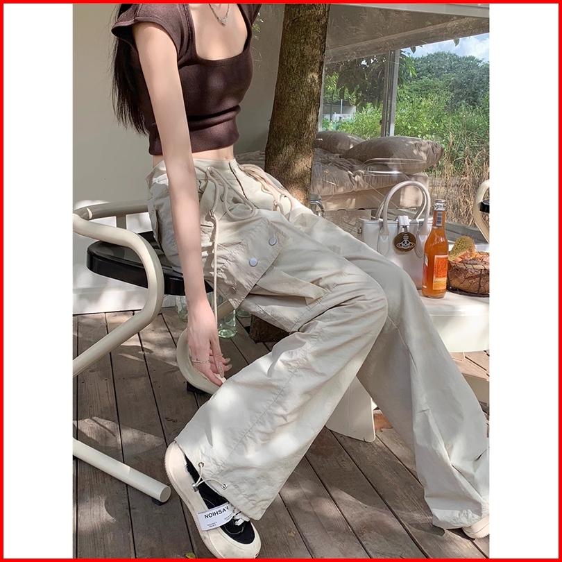 Celana Kasual Wanita Kaki Lurus Longgar Pinggang Tinggi Gaya Korea Celana Cargo Aprikot Serut
