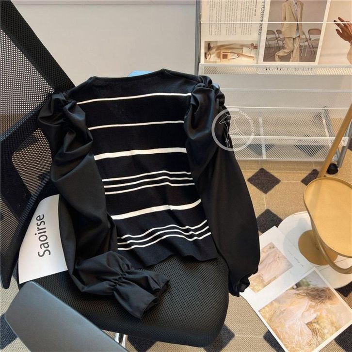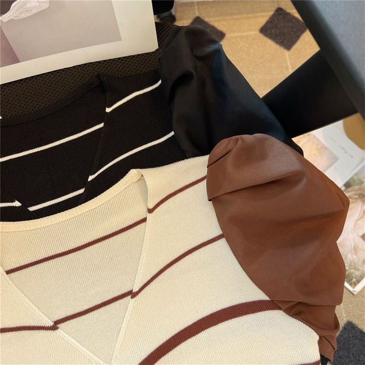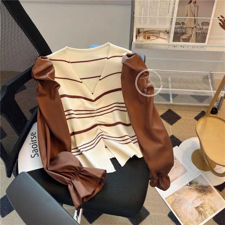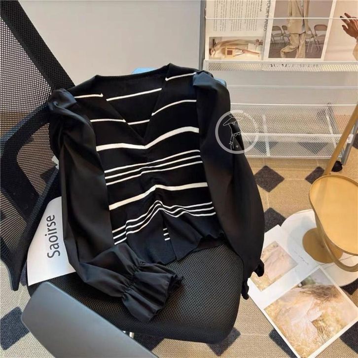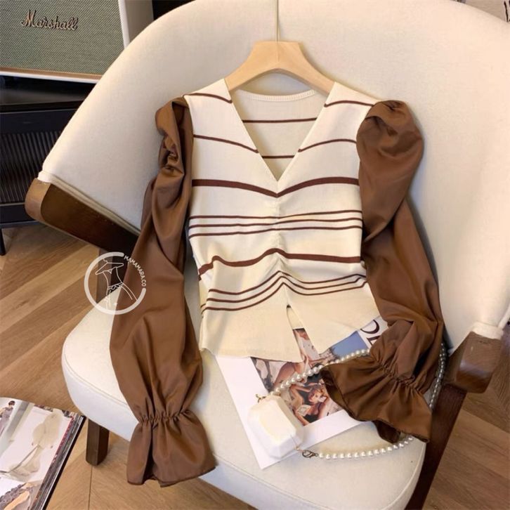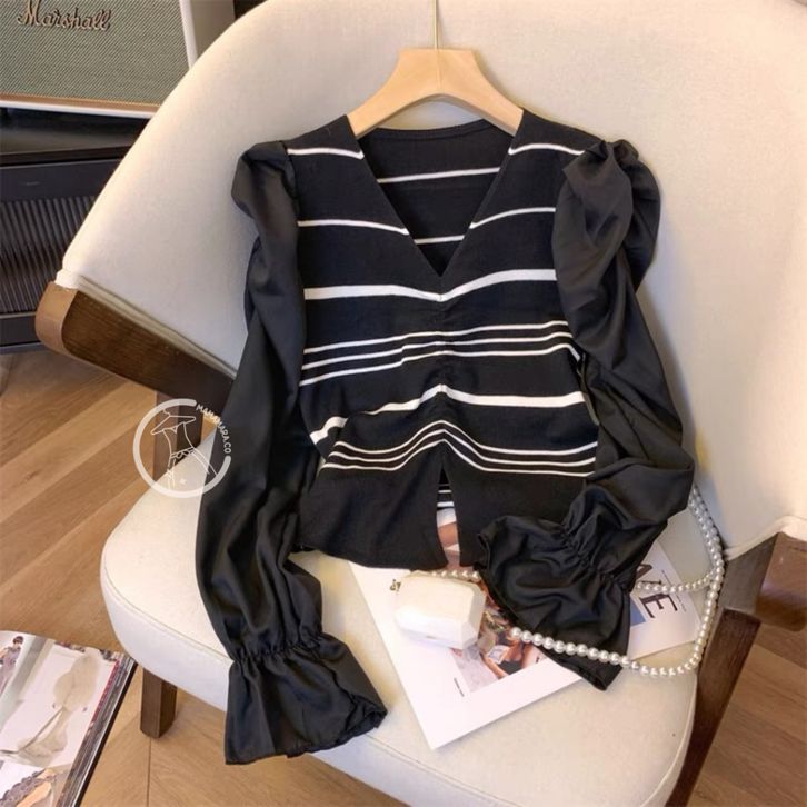 MAMAMARA - Atasan Knitwear Garis V-Neck Rajut Wol Blouse Korean Style Pastel Santai Polos Bunga Setrip