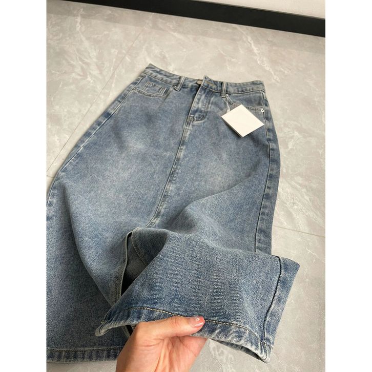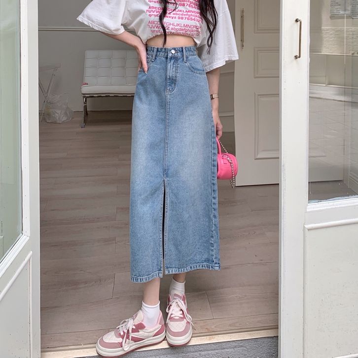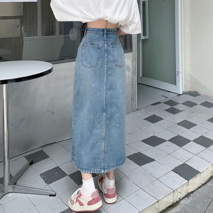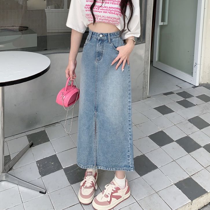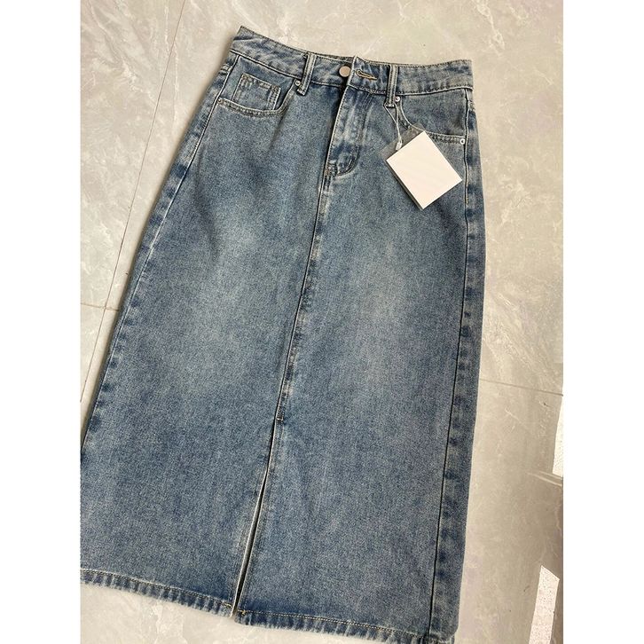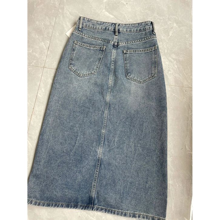 ANNE A-Line Rok Jeans Wanita Sulaman Highwaist Rok Denim Depan Split Rok Jeans