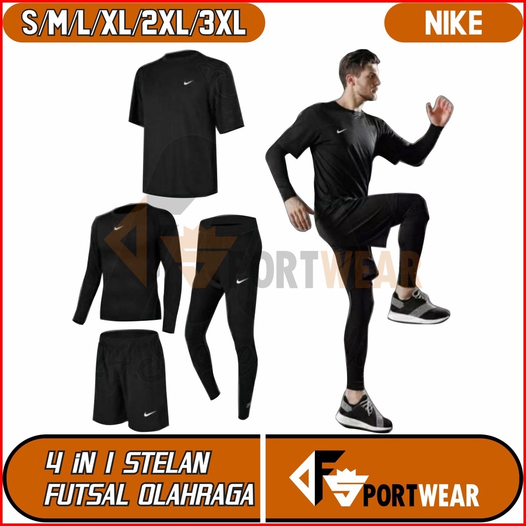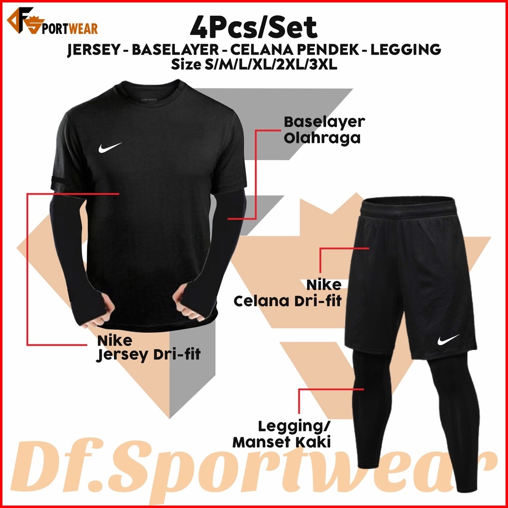 Full Set 4 In 1 Setelan Olahraga Pria Baju Kaos Jersey Badminton Baselayer Football Manset Celana Pendek Celana Legging