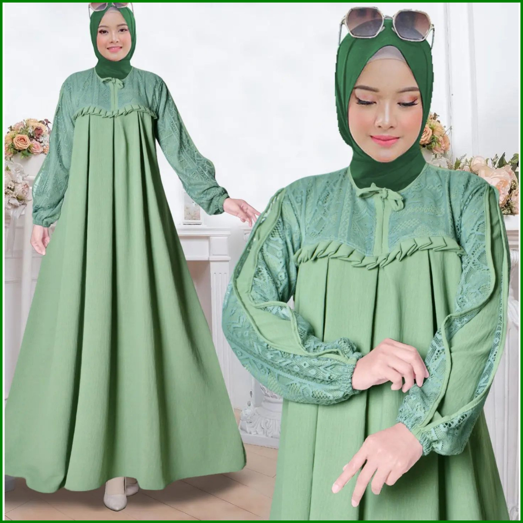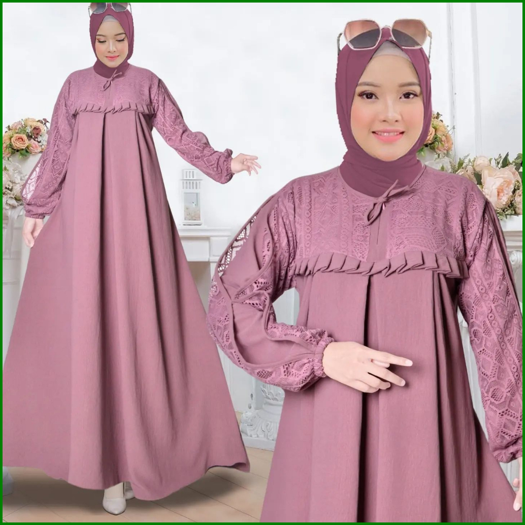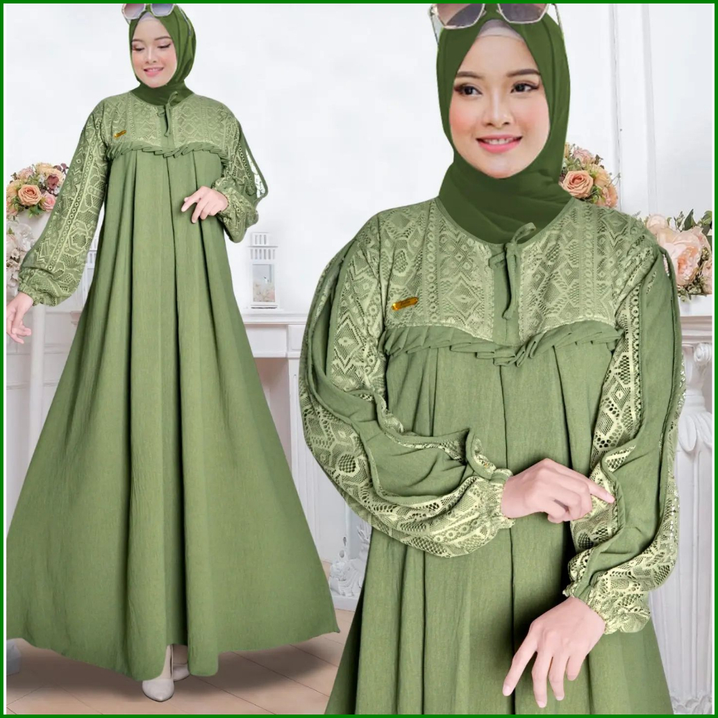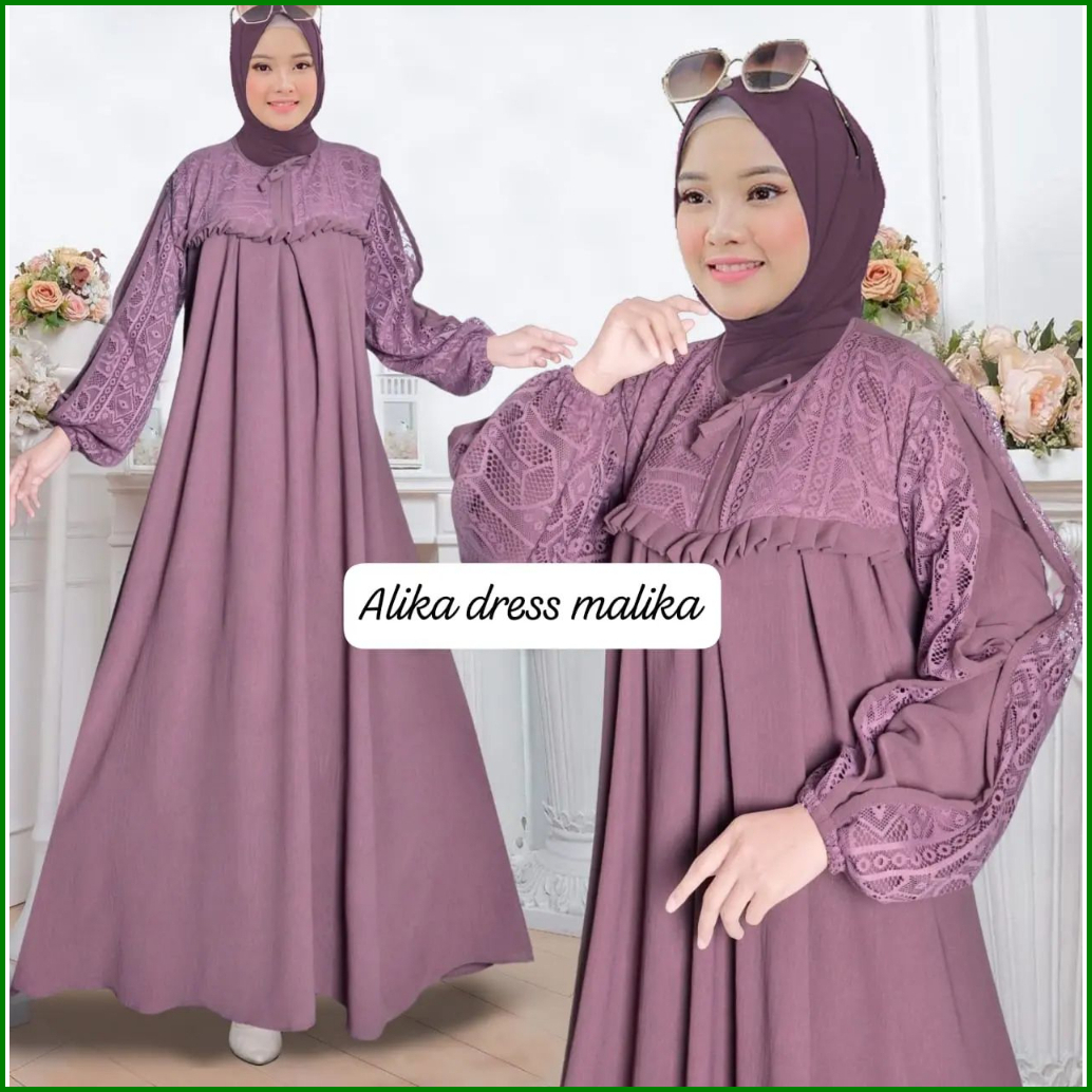 Brukat Alika Dress Gamis Muslimah Wanita Terbaru Bahan Cringkel Airflow Mix Brukat Malika Casual Dress Gom