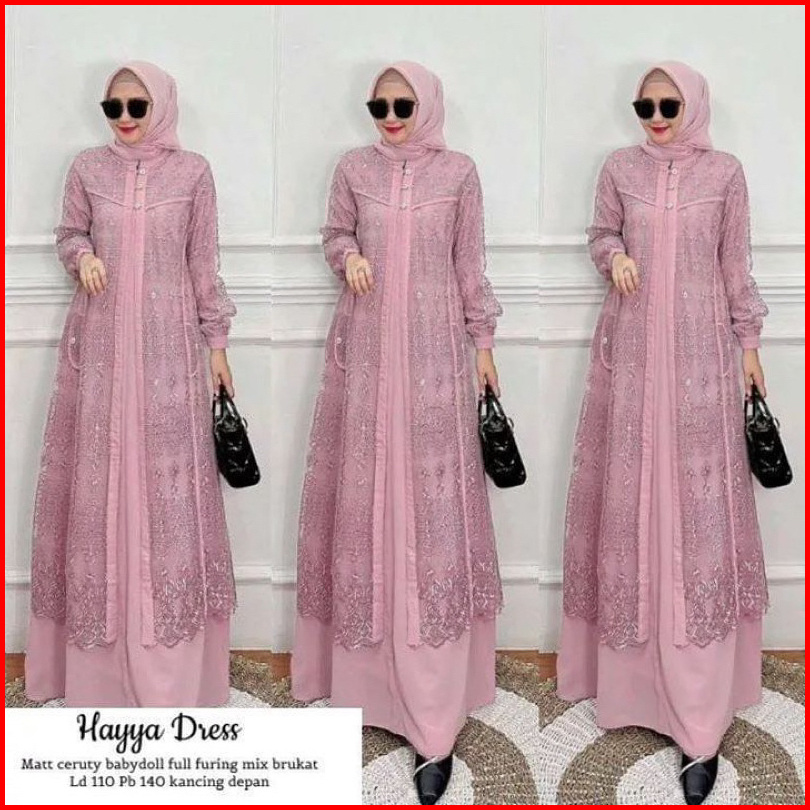 Hayya Dress Wanita Bahan Ceruty Babydoll Full Puring Mix Brukat Busui Frendly Gamis Kondangan Mewah Simple Elegant Ukura