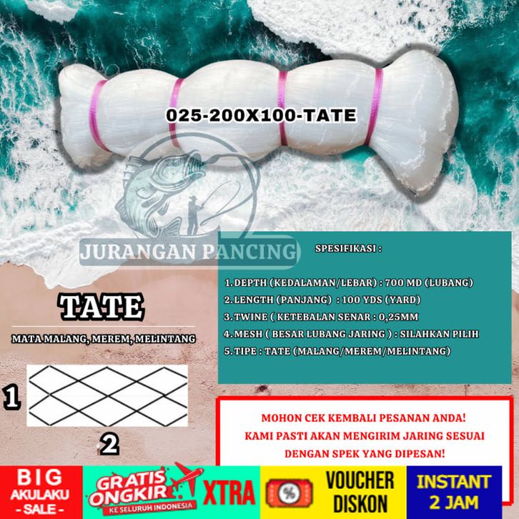 TANPA DP Jaring Senar / Jaring Ikan Nelayan 025 200x100 TATE/MELINTANG (UKURAN LUBANG TINGGAL PILIH)