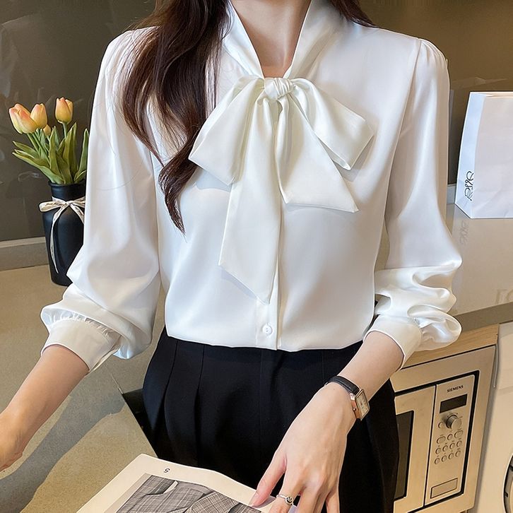 TIANSHUN WOMEN'S SOLID BLUE GREEN WHITE APRICOT BOWKNOT NECK CHIFFON TOP LONG SLEEVE KOREAN SHIRT