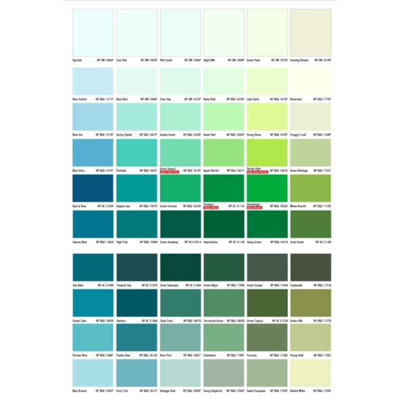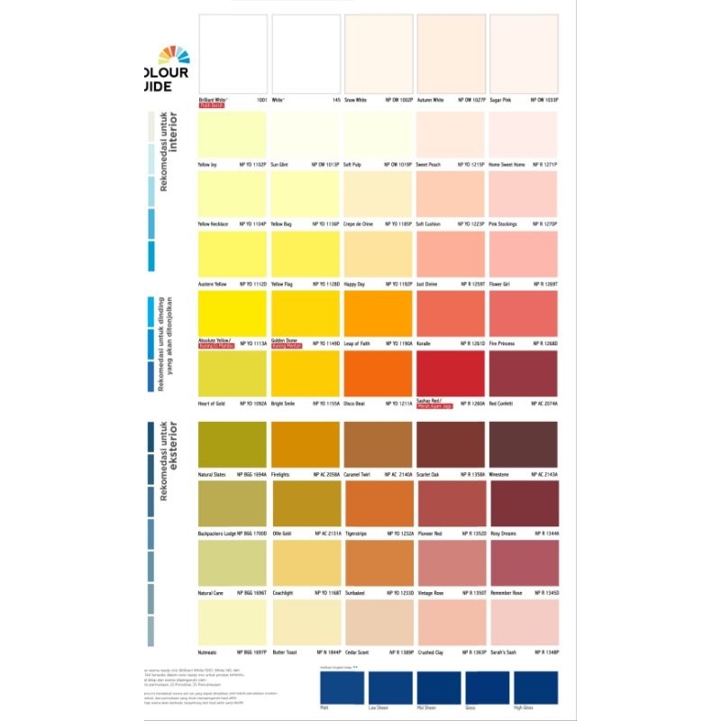 Brilliant White 1001 , Snow White 1002P, Yellow Joy 1102P , Caramel Twirl 2140A, Butter Toast 1844P , Black 144, Purple Heather 1458T , Blue Rhythm 1528P, Sky Blue 1532P , Cerulean 1535T, Teaberry Gray 1900P , Overalls 1907P, Green Montage 1752T , Aegean Sea 1597D, Sweet Escapade 1759T , Reticent White 1083P, Swanlike 1021P , White Lilac 1050P, Abacadabra 2034P , Warm Toast 1173P, Gray Prose 1984P , Gray Suit 2027P, Pewter Gray 1978P , Smoking Gray 2045T, Saddle Brown 1883A , Affogato 2134A, Whestone 1994T , Gray Mystic 1986P, Stilietto Gray 1992P , White 145, Warna Lain Chat Kami