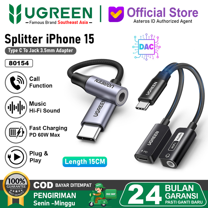 UGREEN Converter Splitter iPhone 15 Type C to Jack 3.5mm DAC Open Mic