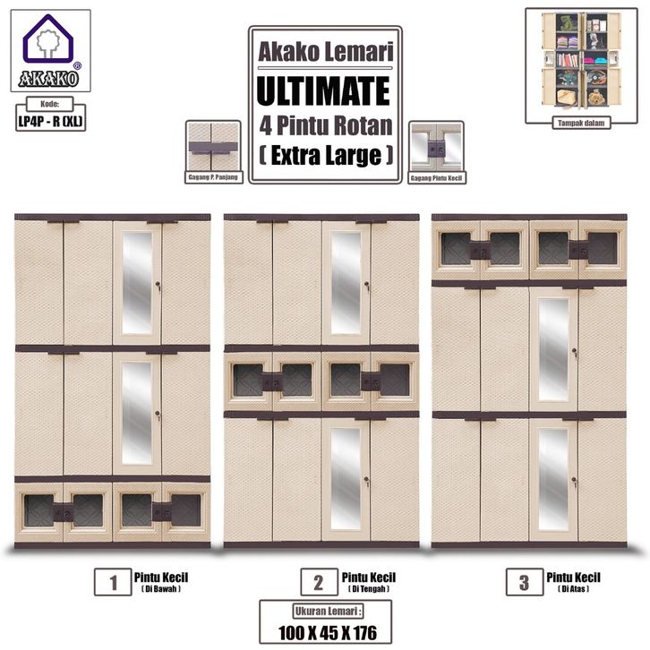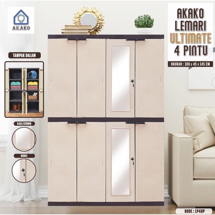 Lemari Plastik Pakaian BESAR JUMBO RAK FULL GANTUNG Akako Ultimate 4 Pintu Cermin Kaca KUNCI Cream Laci