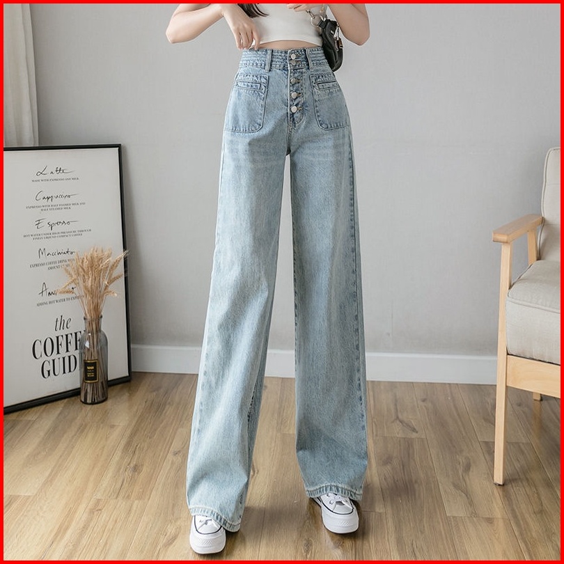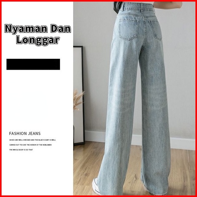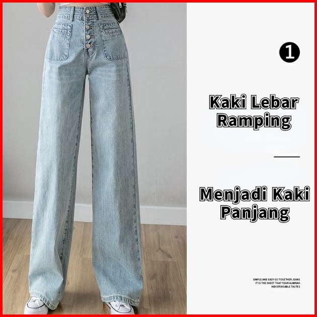 Celana Denim Kaki Lebar Pinggang Tinggi Wanita