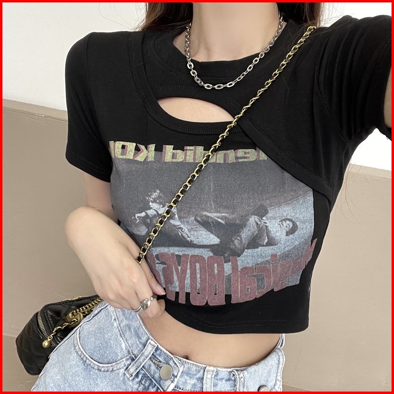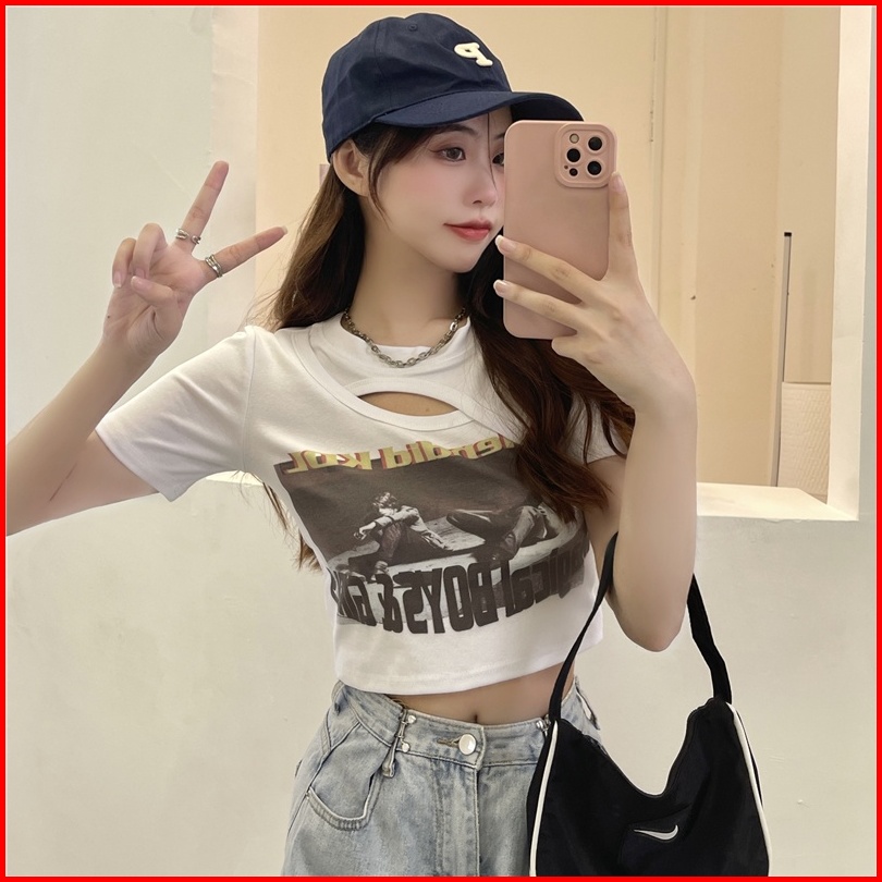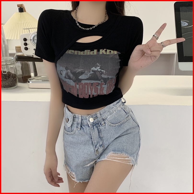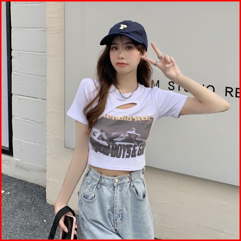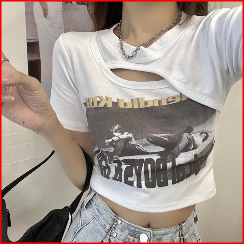Musim Panas Wanita Korea Baru Crop Top Printing Kaos Lengan Pendek Berongga Seksi Kreatif