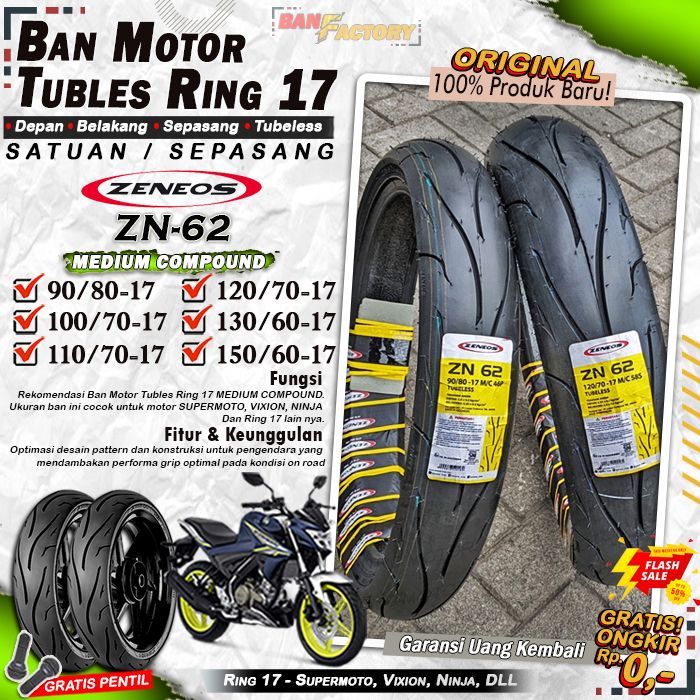 Sepasang Ban Motor Tubles ZENEOS ZN62 Ring 17 Ban Motor Tubeless Depan Belakang Vixion R15 Ninja Ring 17