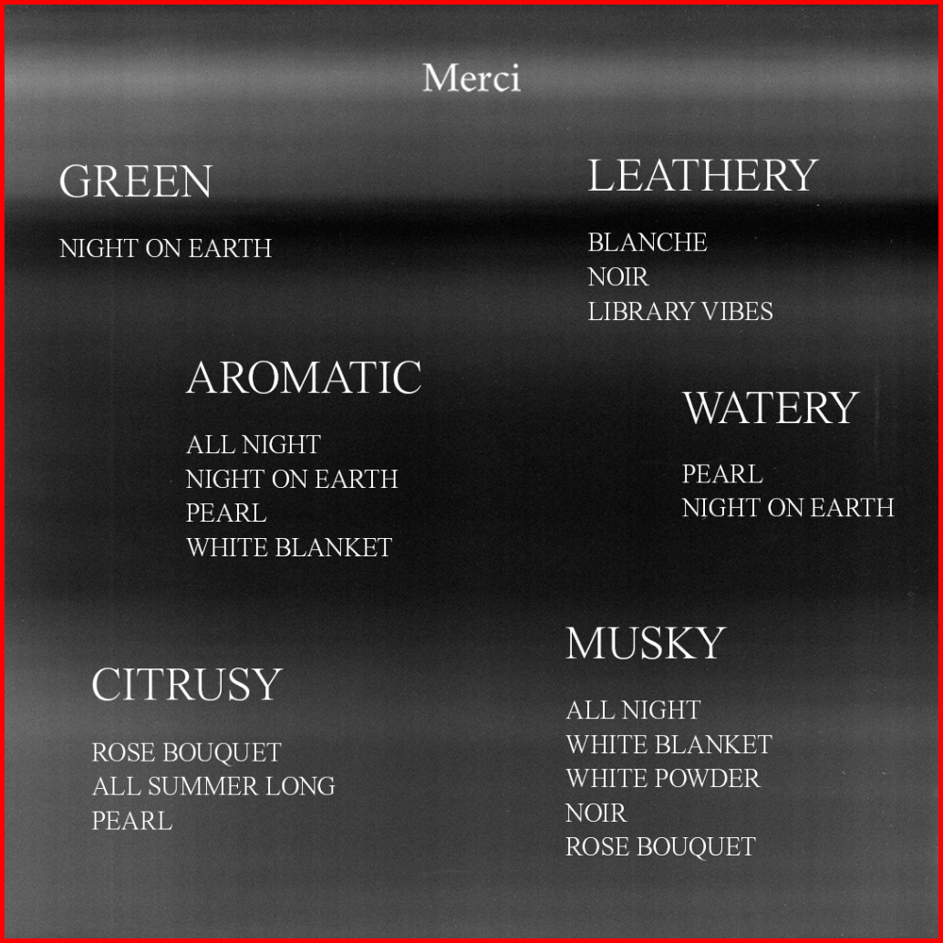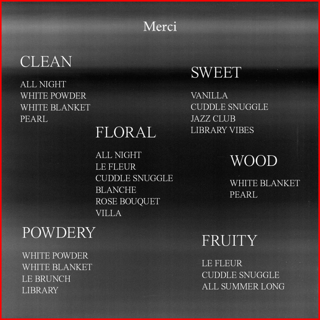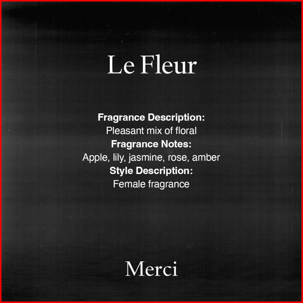 Le Fleur, Cuddle Snuggle, Vanilla, Villa, White Powder, Rose Bouquet, Jazz Club, Library Vibes, Noir, White Jasmine, White Dove, Blanche