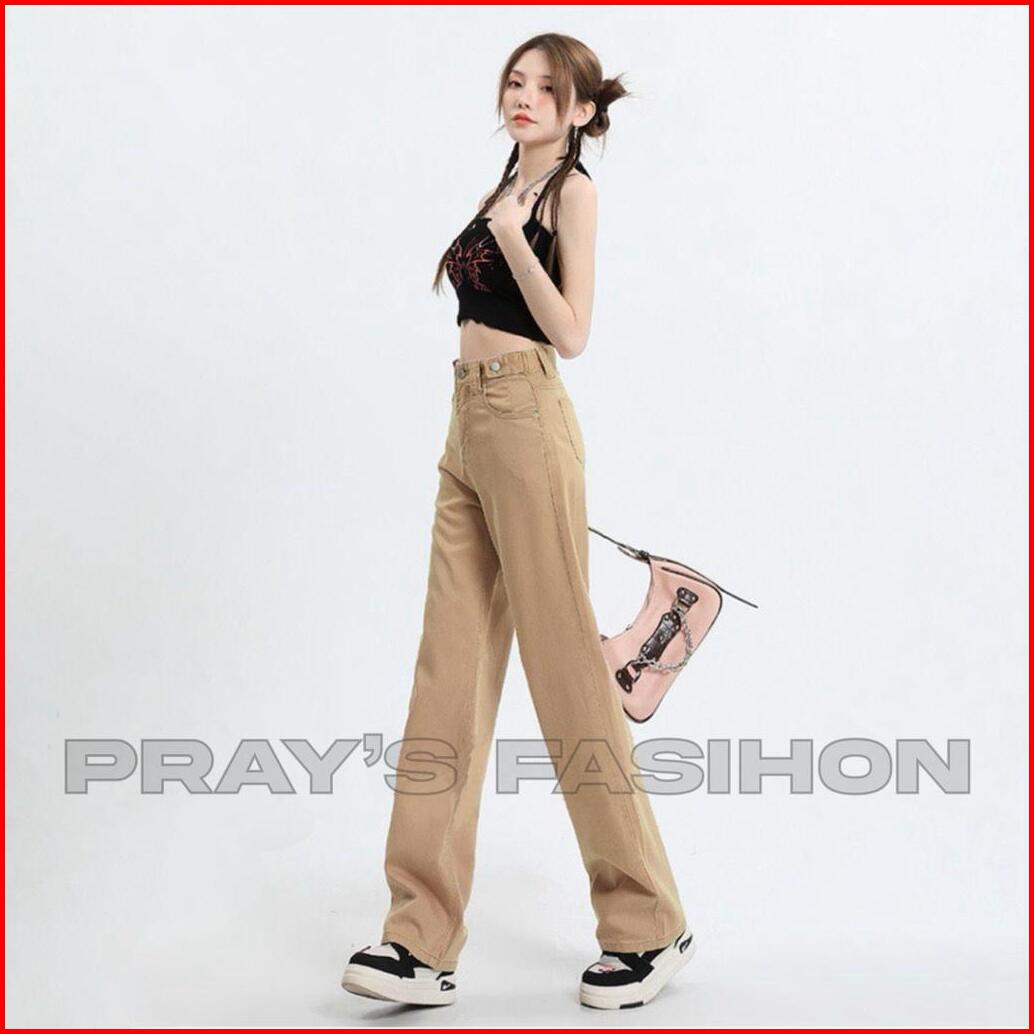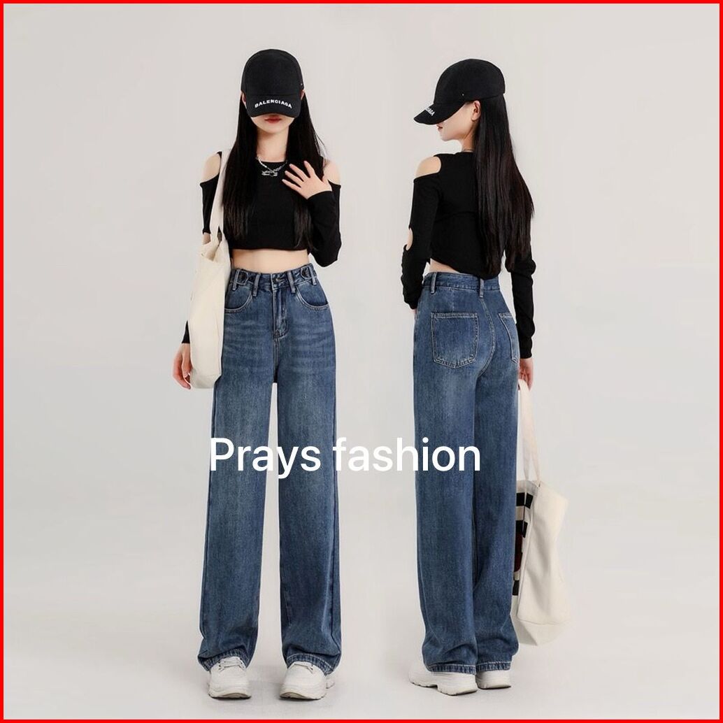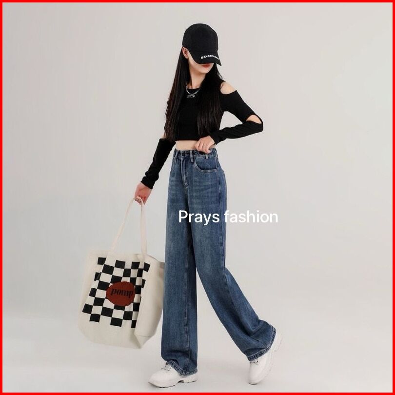 Prays Fashion - Biru Laut Highwaist Kulot Jeans Wanita Korean Jeans Wanita Loose Pinggang Dapat Disesuaikan Adjustable