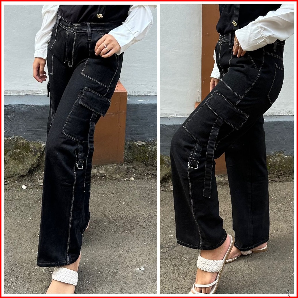 Trivela - Forly Cargo Jeans Wanita - Celana Highwaist Cargo Loose Snow Boyfriend Kulot Jeans Korea Street Style Cargo Ce