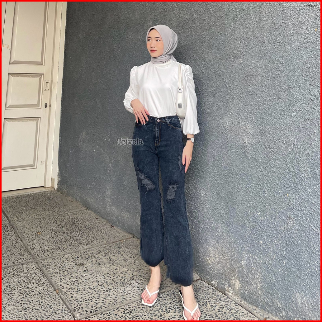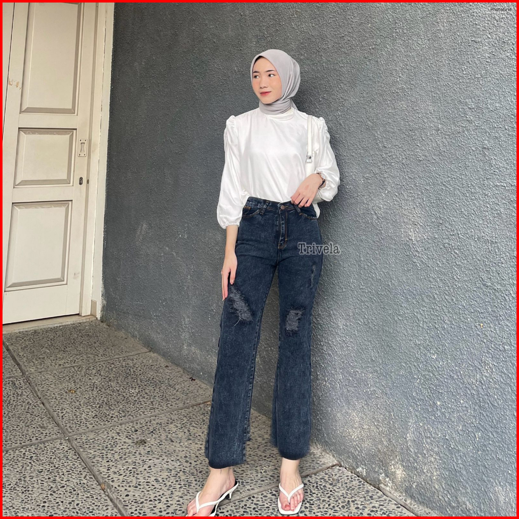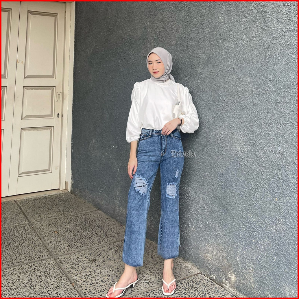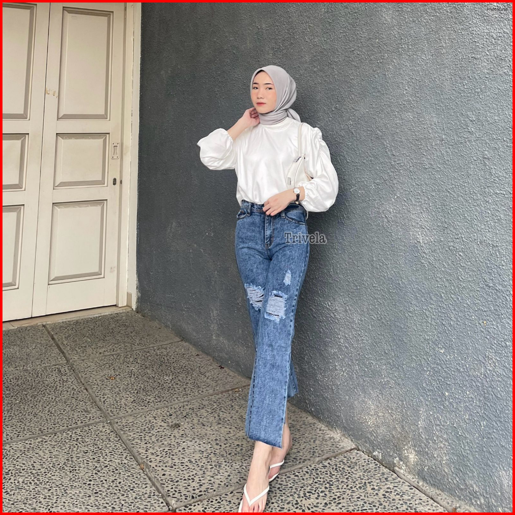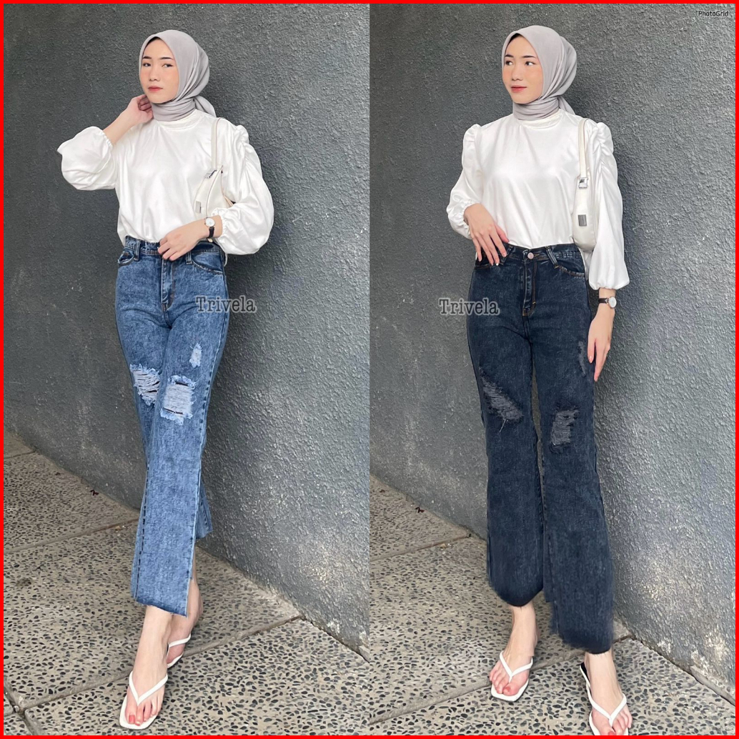 Trivela - Kulot Jeans Unfinished Wanita Sobek Lapis L Labela Cullotes