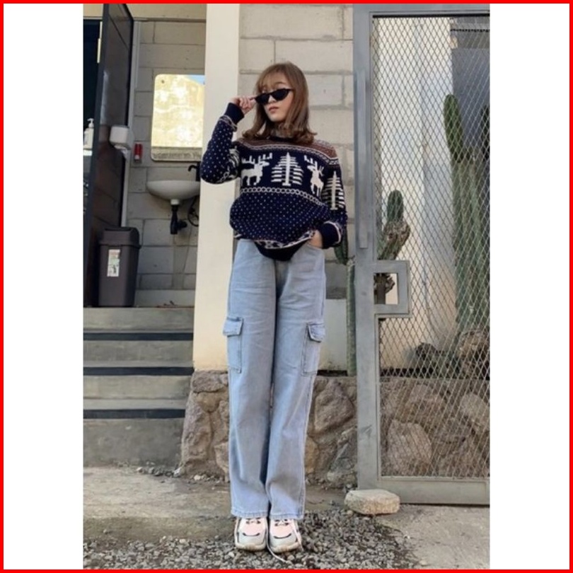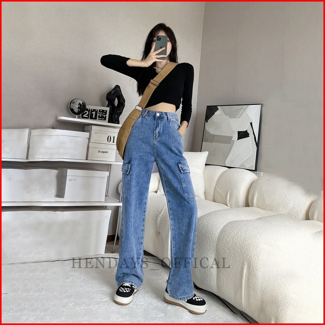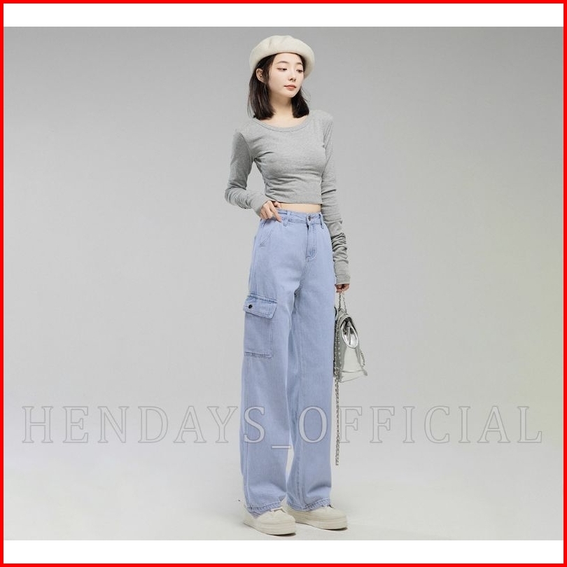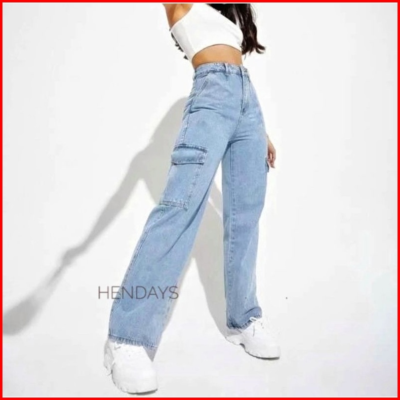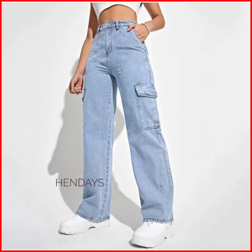 Celana Highwaist Cargo Jeans Wanita Loose Light Blue