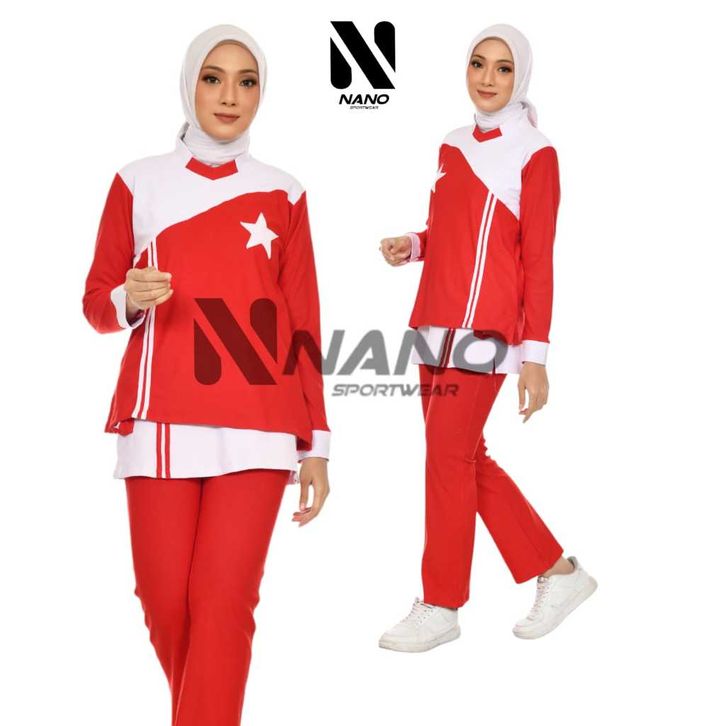 Setelan Senam Merah Putih Wanita One Set Pakaian Olahraga Perempuan Satu Set Celana Kaos Panjang Muslim Stylish Trend