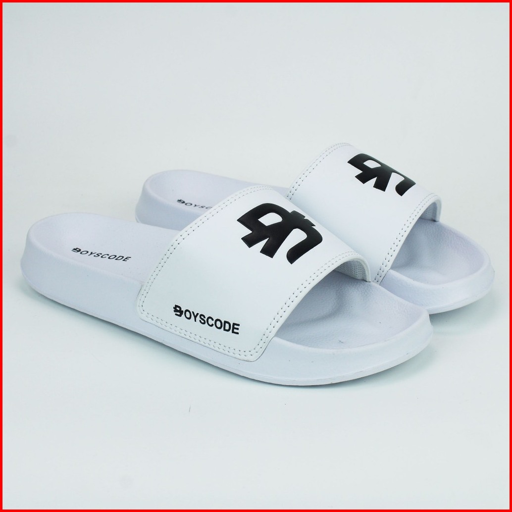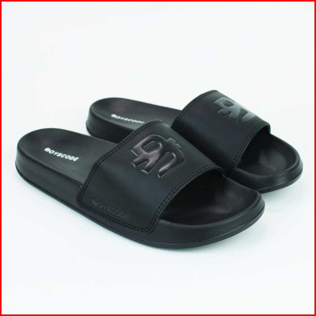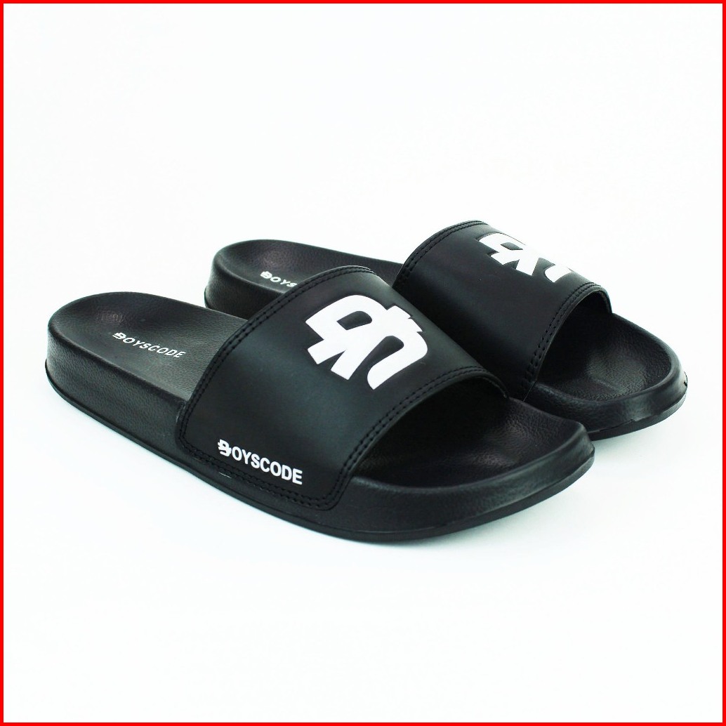 Boyscode Sendal Selop Karet Pria Wanita Motif Big Logo Hitam Putih Fullblack Slip On Slide