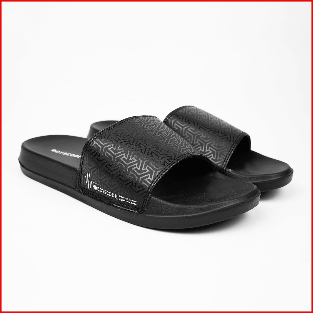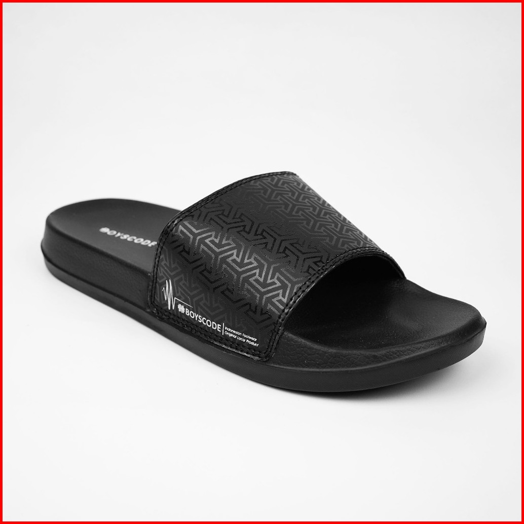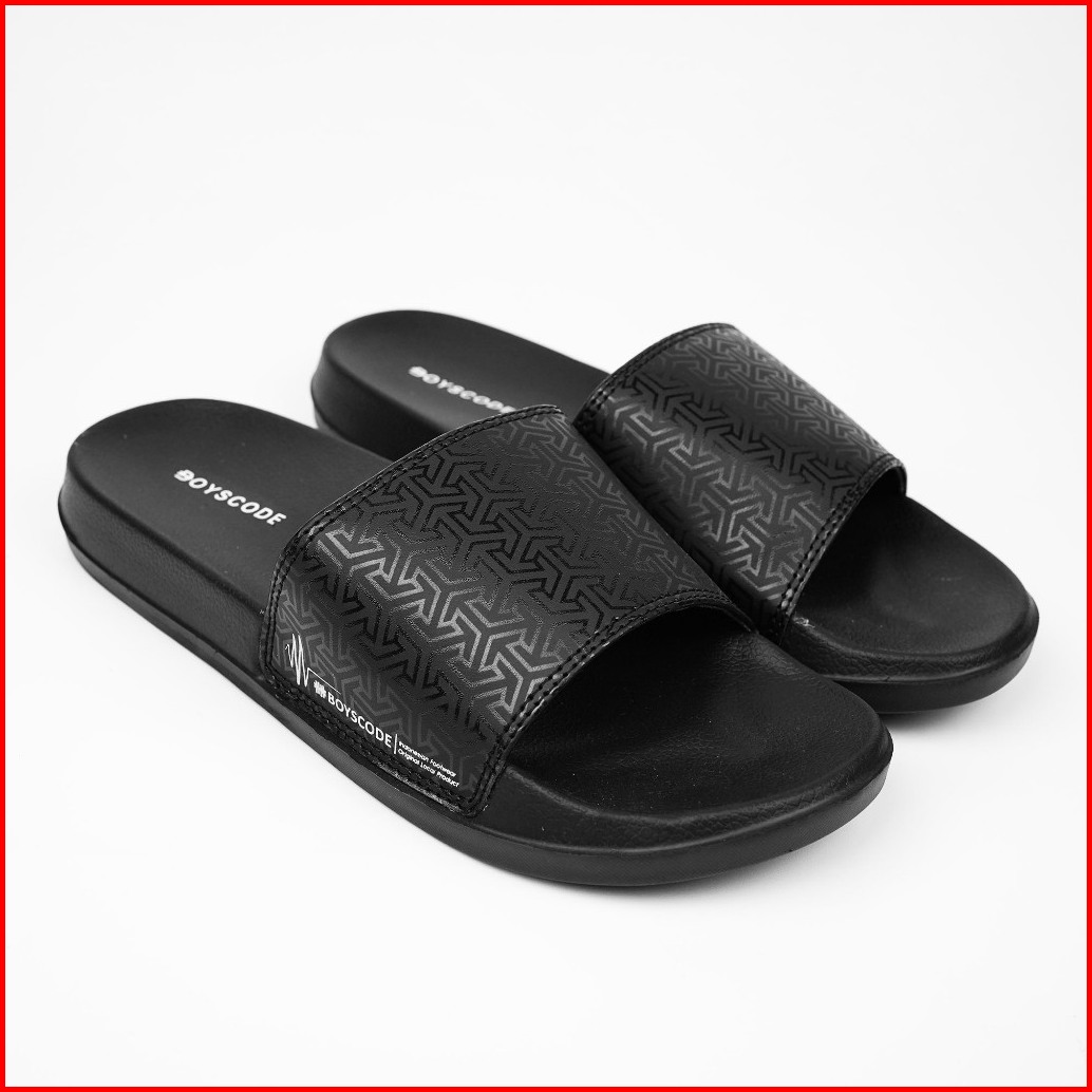 Boyscode Sendal Selop Karet Distro Pria Wanita Motif Triangle Hitam Fullblack