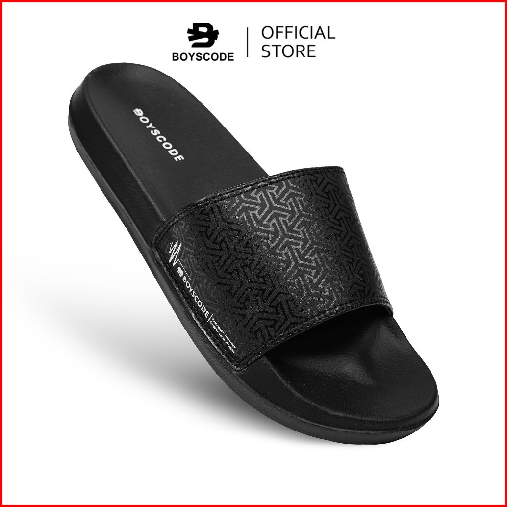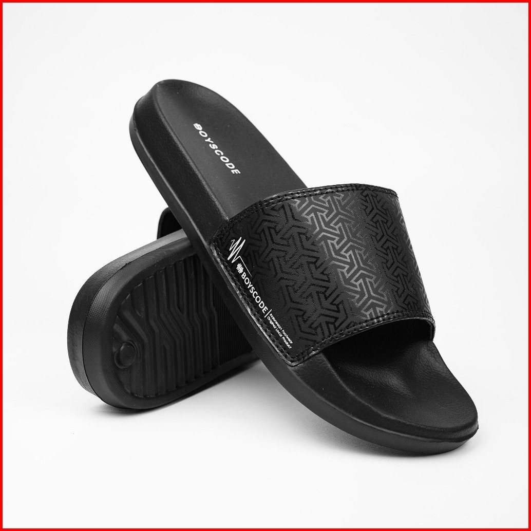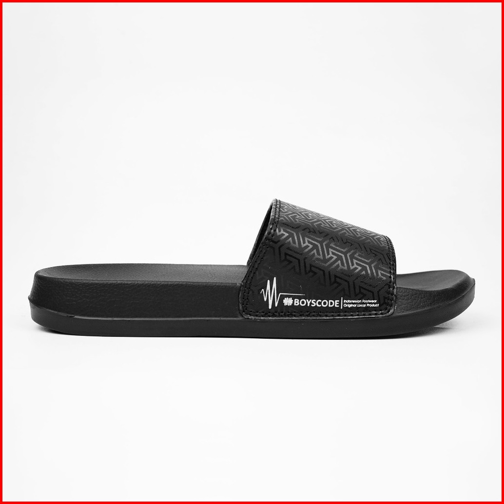 Boyscode Sendal Selop Karet Distro Pria Wanita Motif Triangle Hitam Fullblack