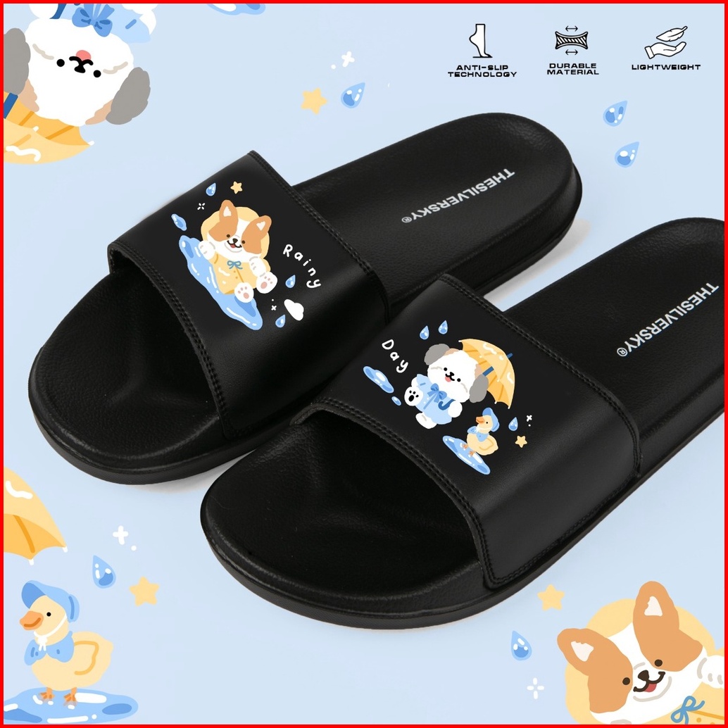 Thesilversky Rainy Corgy Shihtzu Duck Black Slides Premium Slip On Kids Adult Korean Sandals