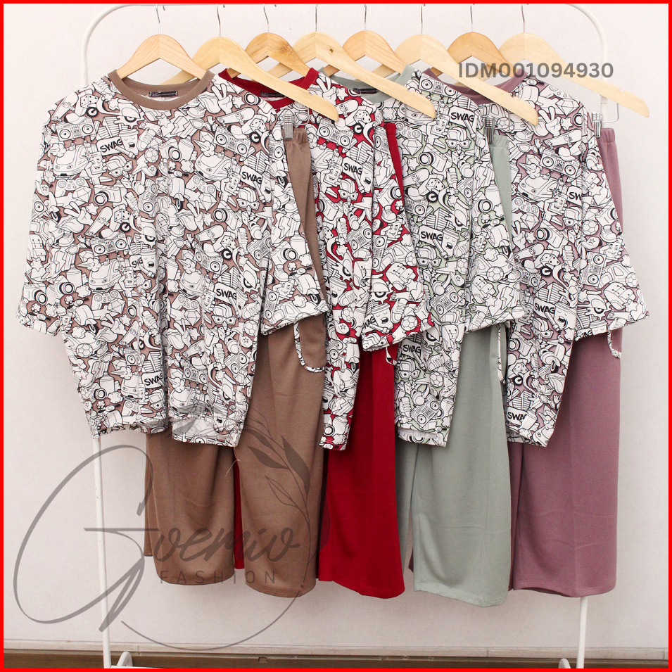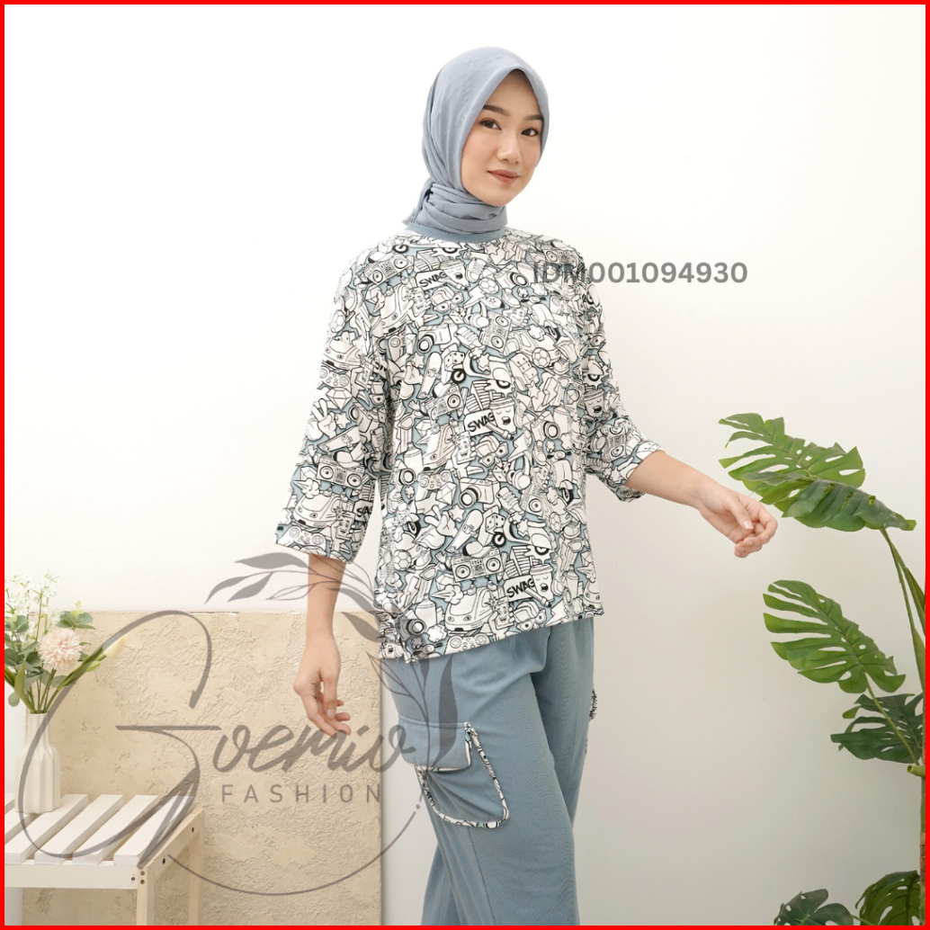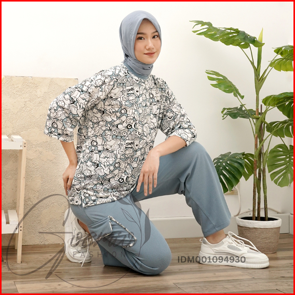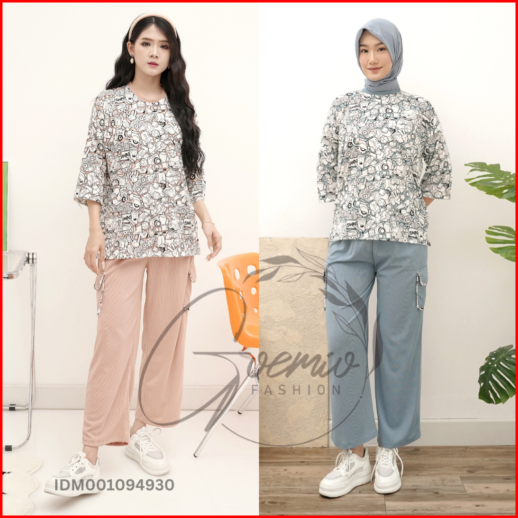 Ilook Ld 120 One Set Cools Setelan Katun Knit Combi Atasan Motif Dan Celana Panjang Cargo Wanita Motif Lengan 3 4