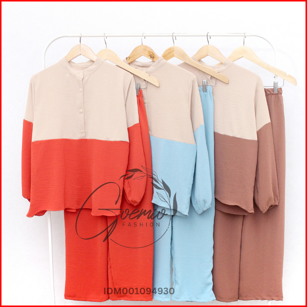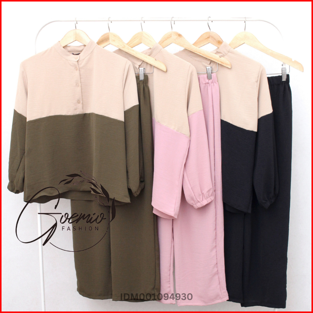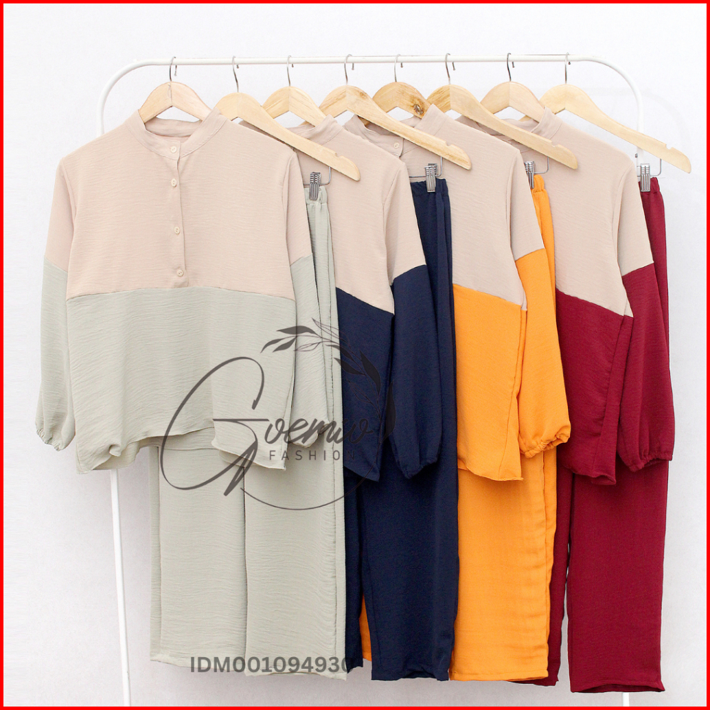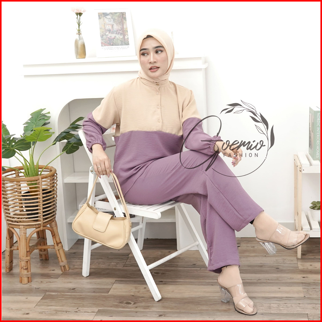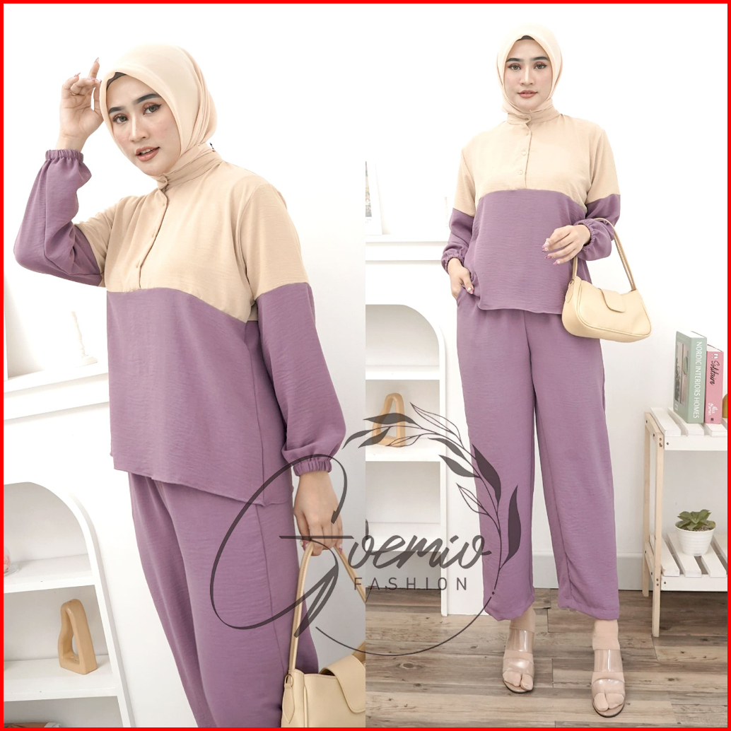 Ilook One Set Lova Setelan Cringkel Combi Atasan Dan Celana Panjang Wanita Polos Lengan Panjang