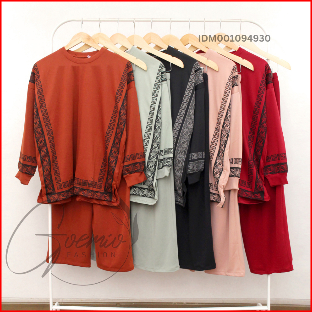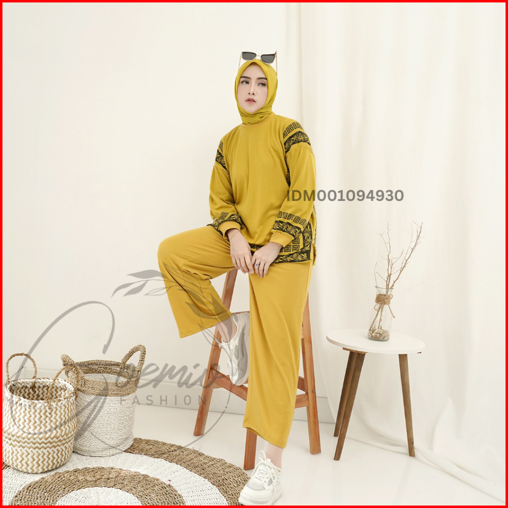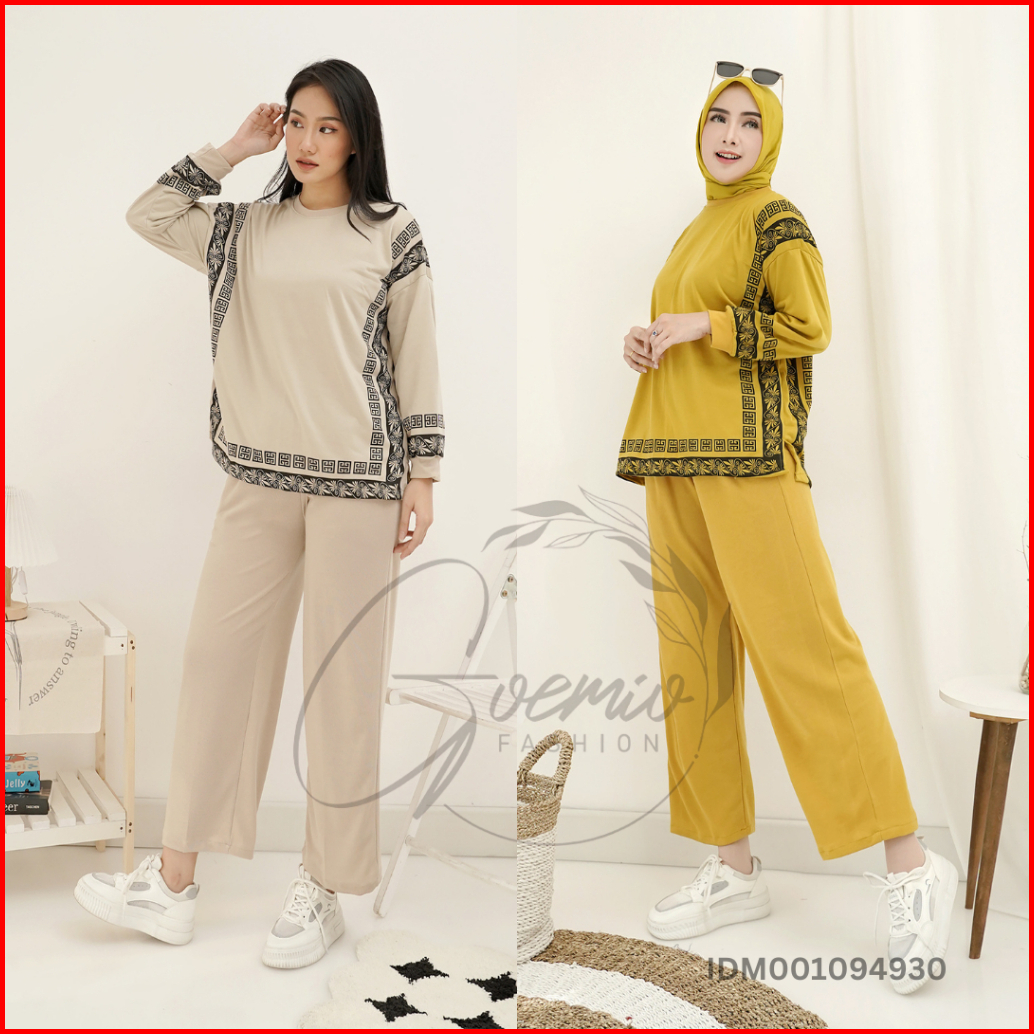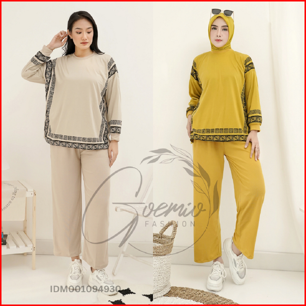 Ilook Ld 120 One Set Arafah Setelan Katun Knit Combi Atasan Garis Dan Celana Panjang Wanita Polos Lengan Panjang
