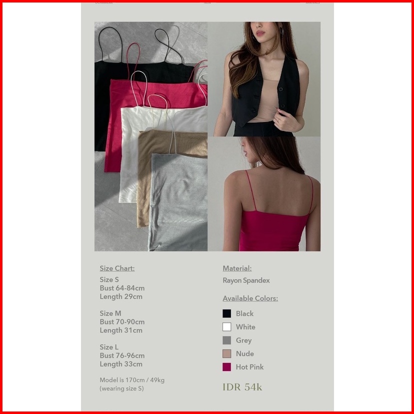 Spaghetti Strap Tanktop Basic Tanktop Camisole Atasan Wanita Kemben Setali Kaos Premium Murah Berkualitas