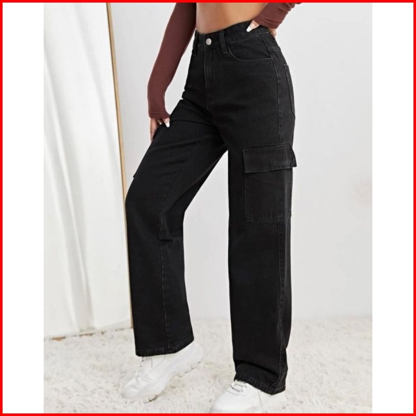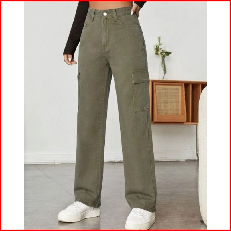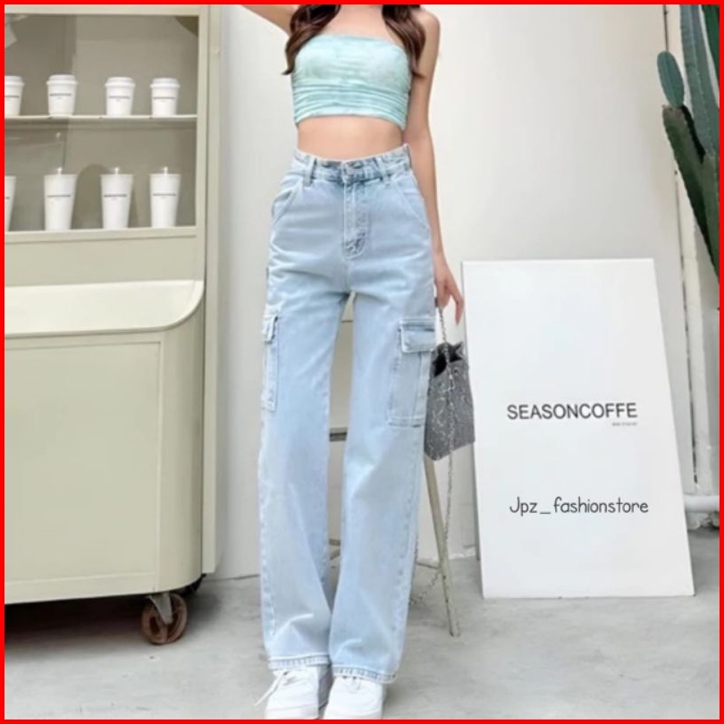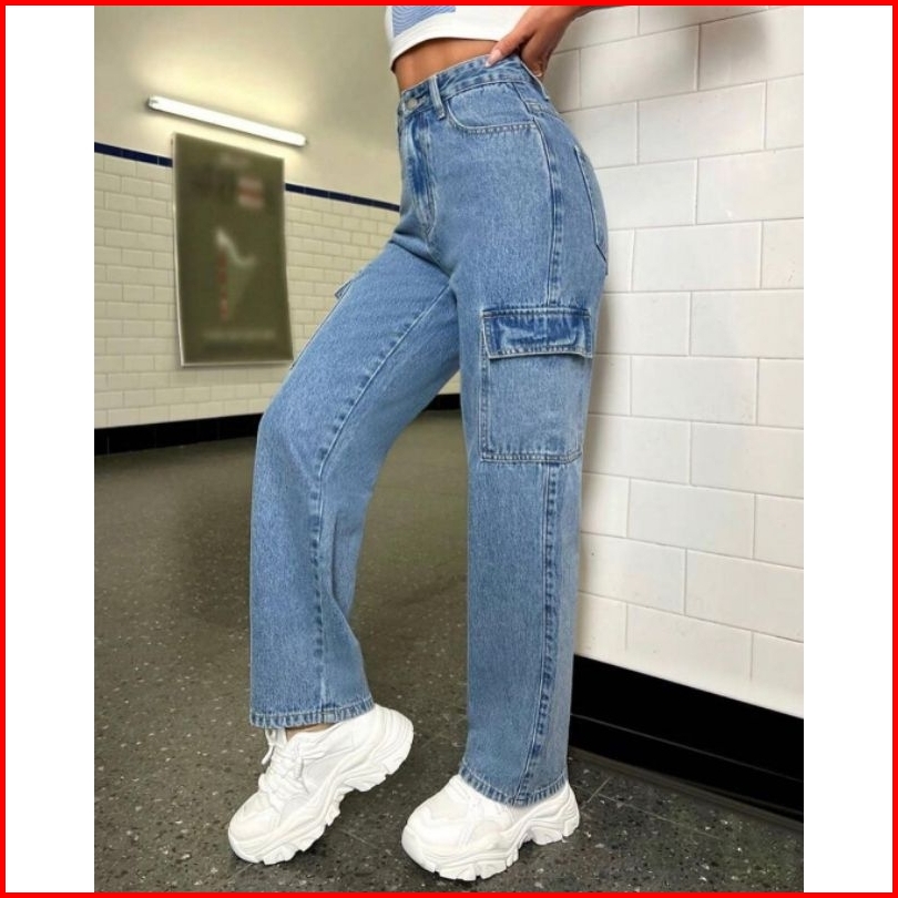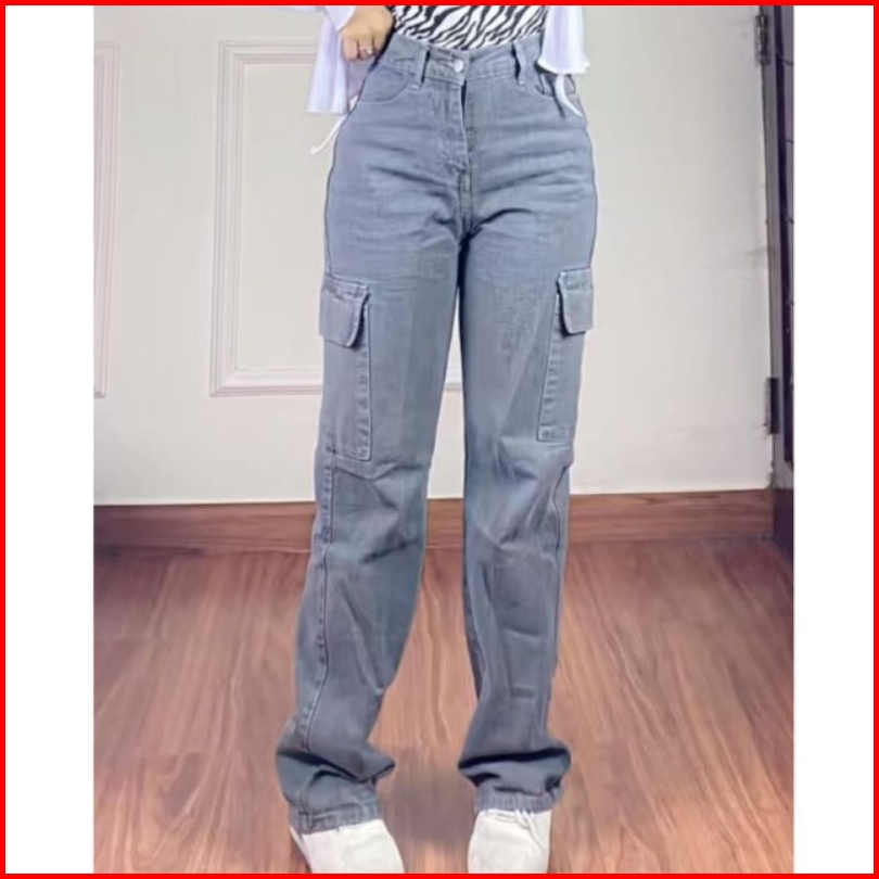Celana Higwaist Cargo Loose Jeans Wanita Premium Tebal