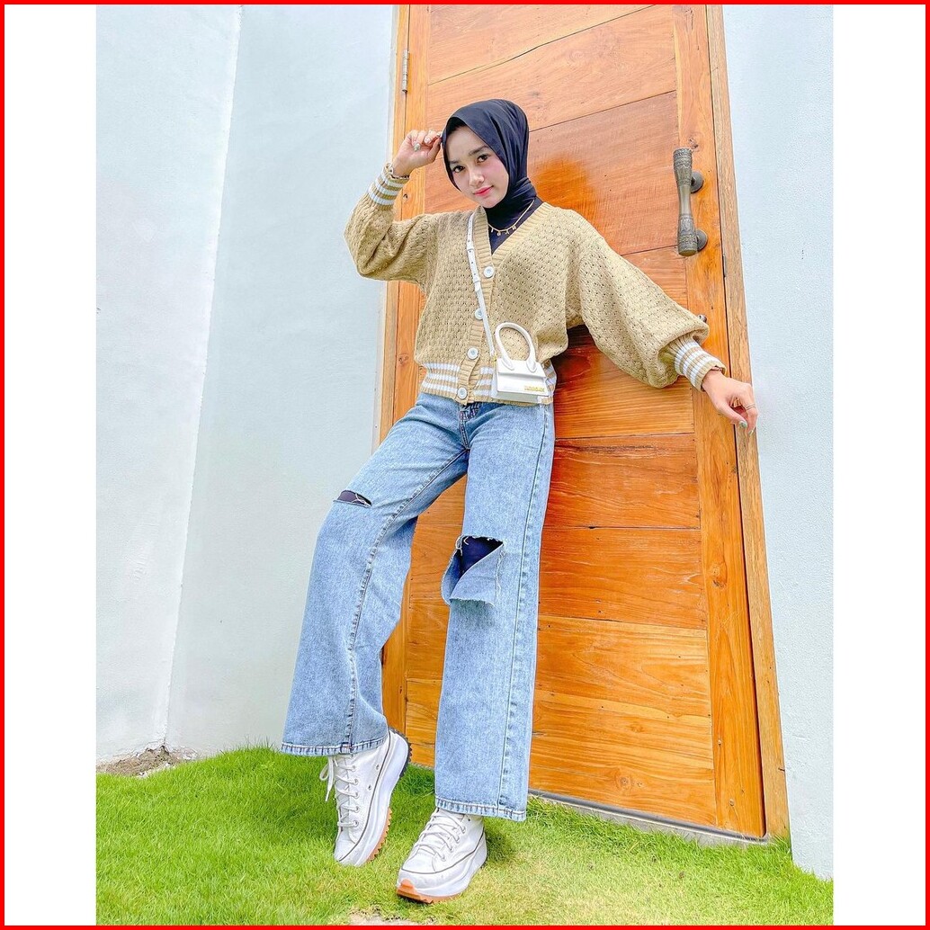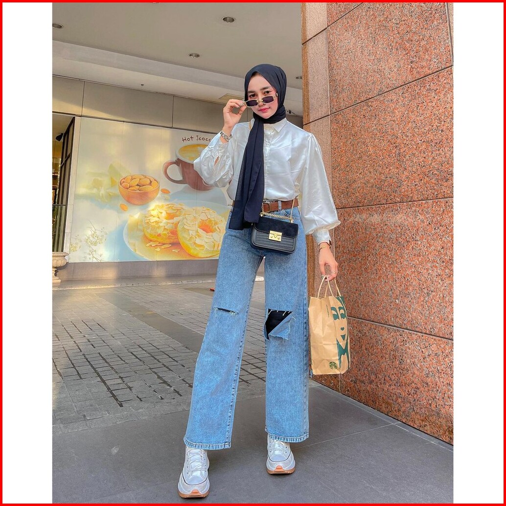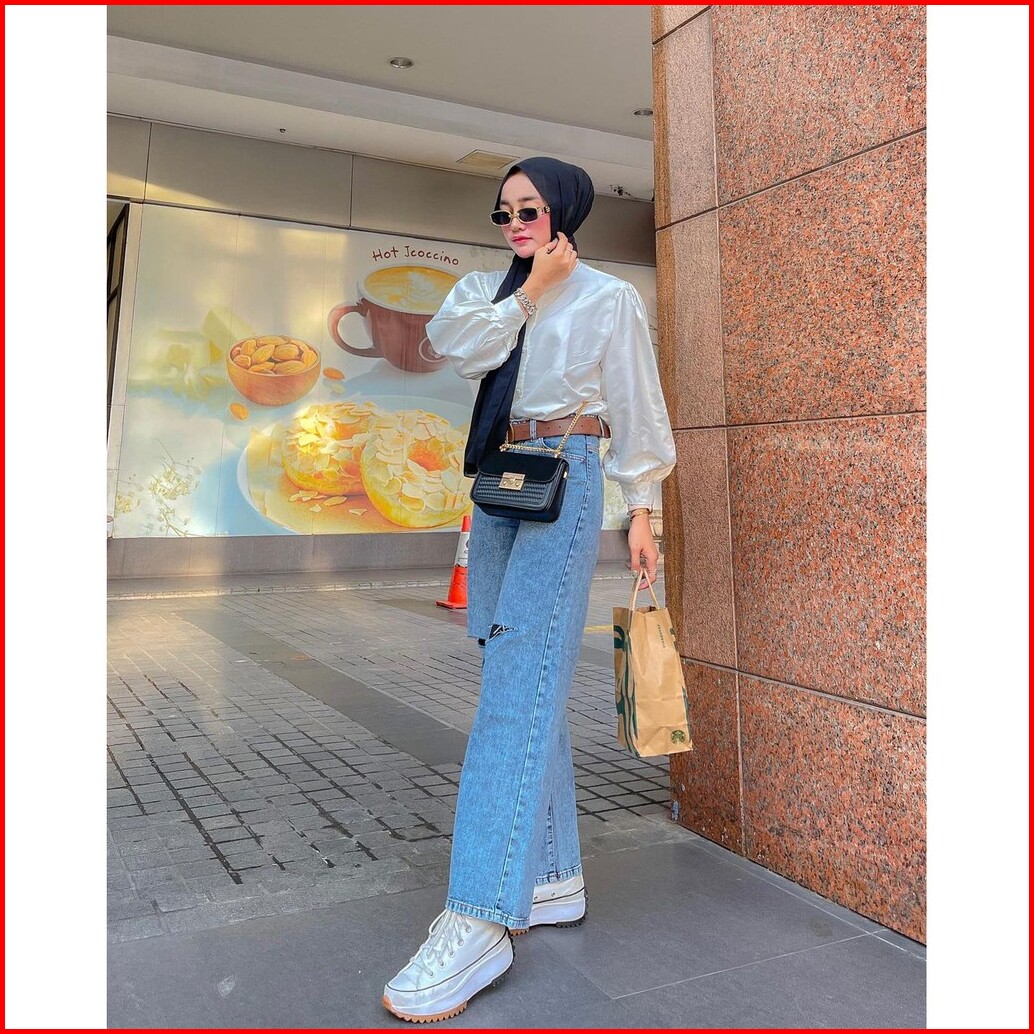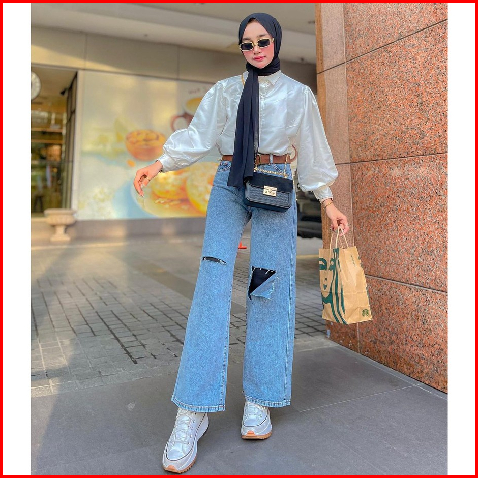 Highwaist Kulot Jeans Wanita Loose Ripped Sobek Belle
