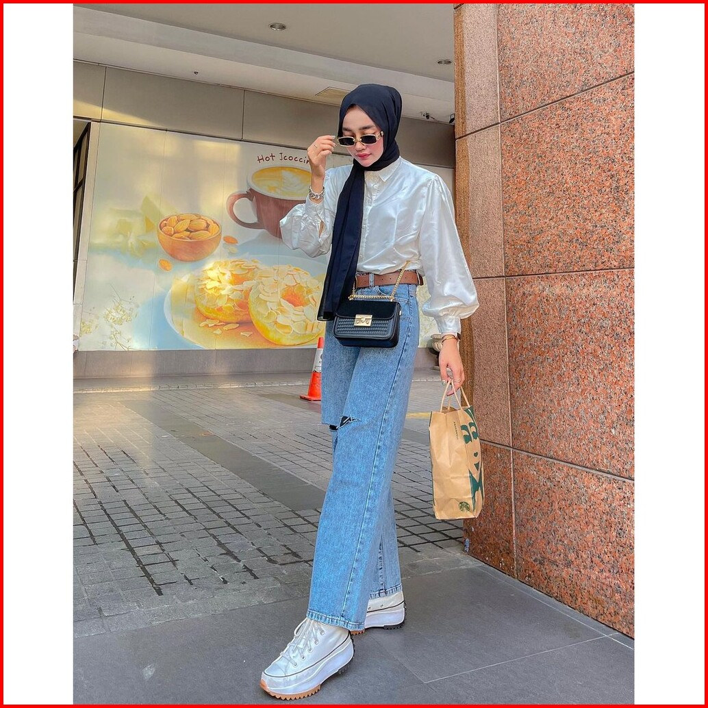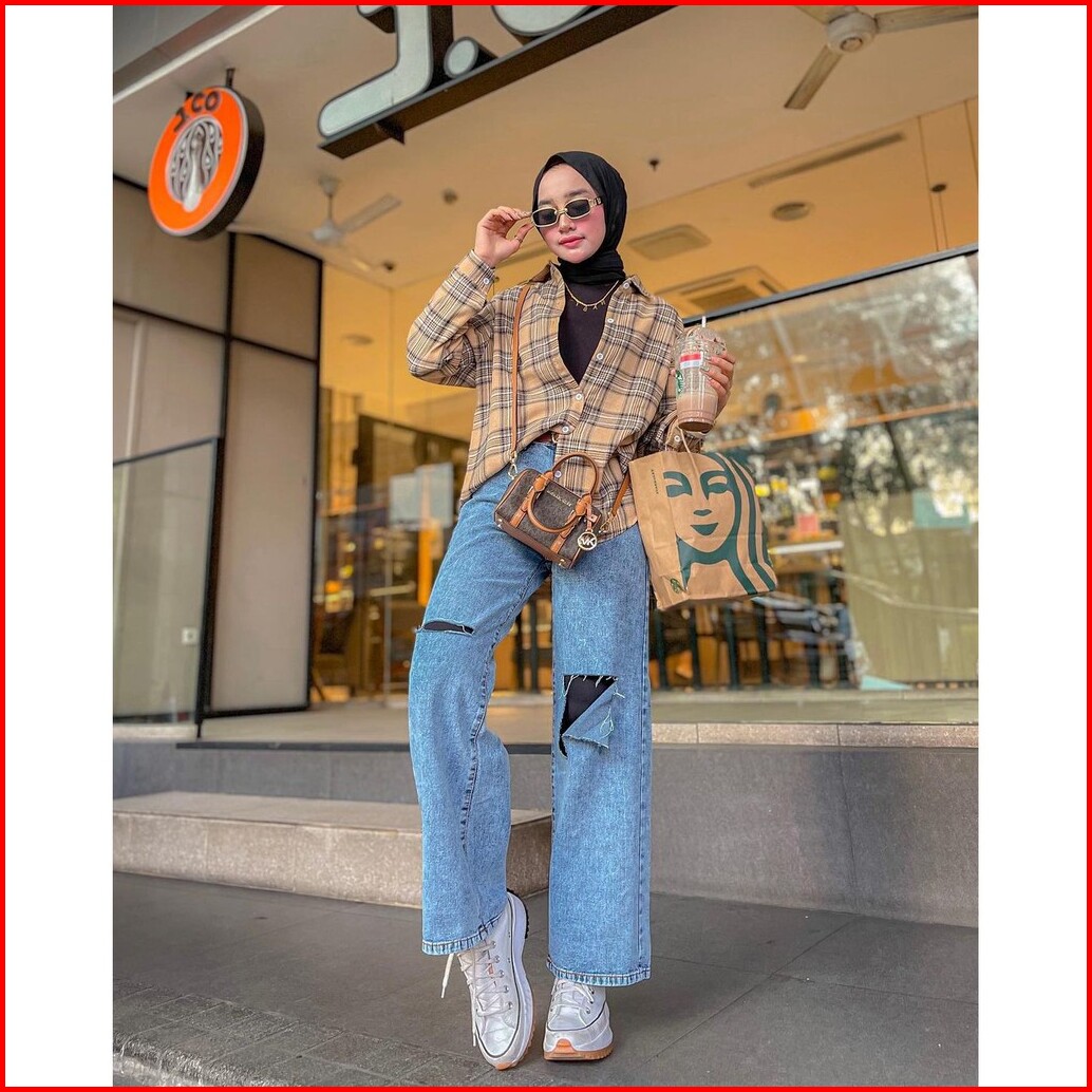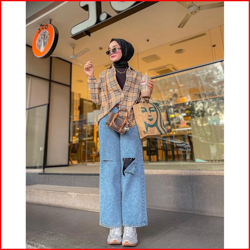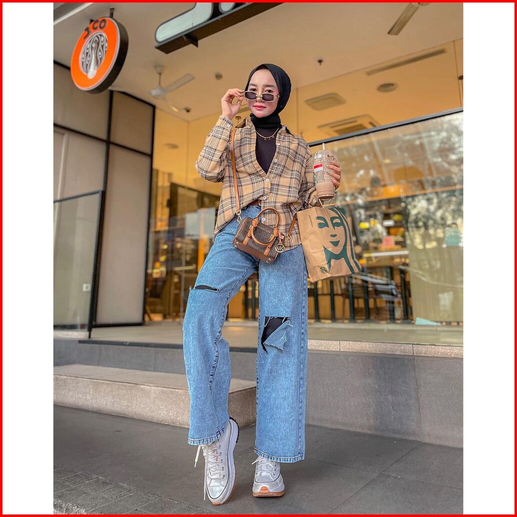 Highwaist Kulot Jeans Wanita Loose Ripped Sobek Belle