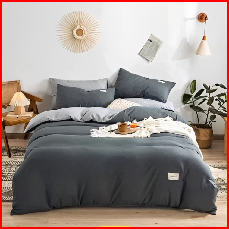 Two Tone Bedcover Polos Kombinasi Sprei Set Katun Adem Bahan Halus Abu Tua Muda Minimalis