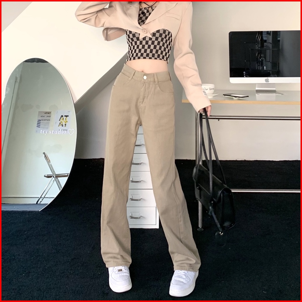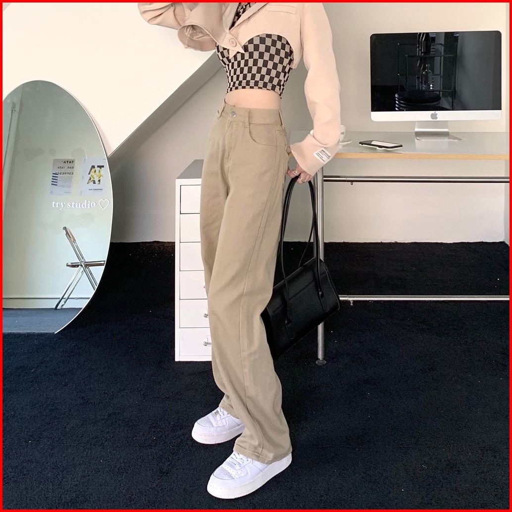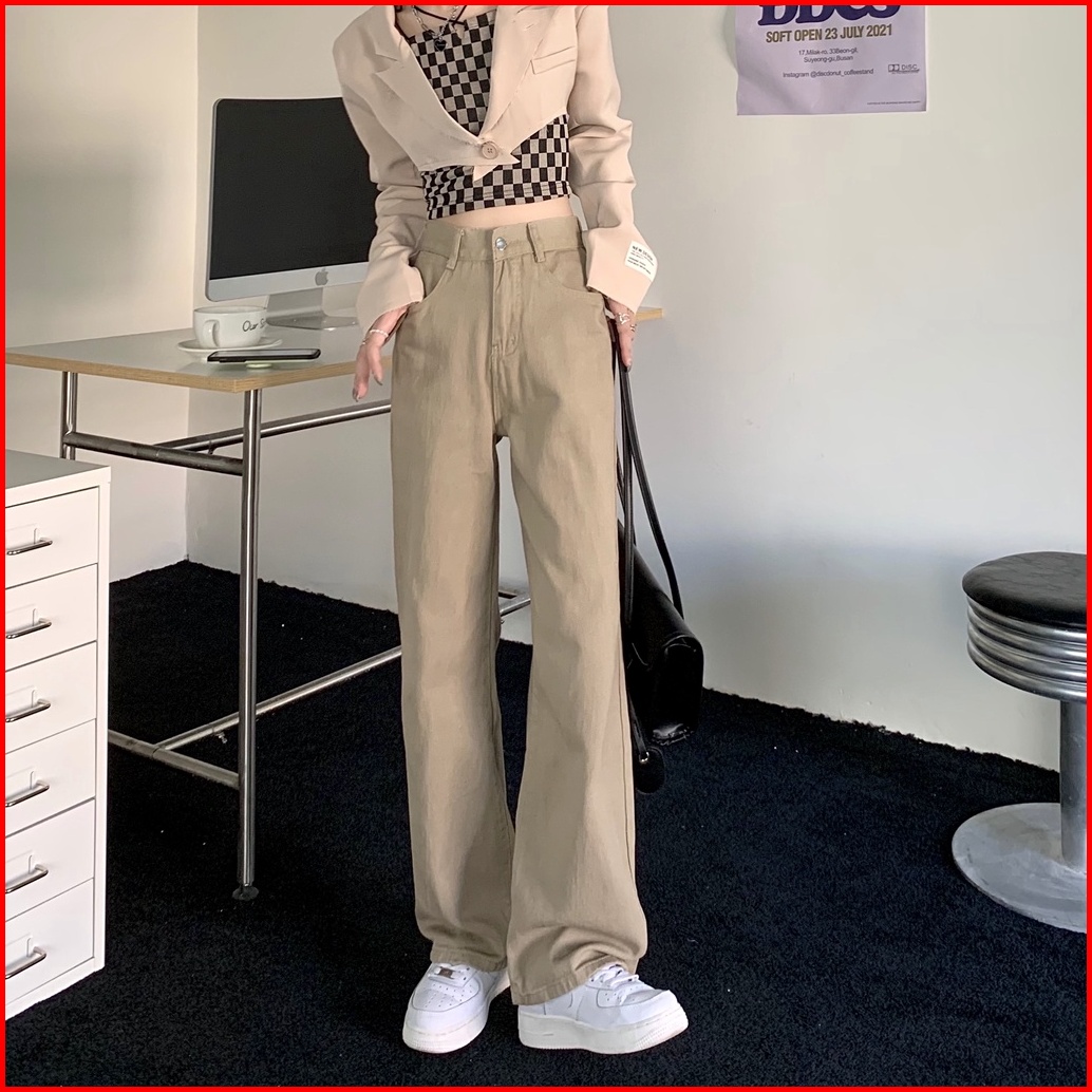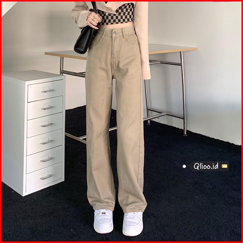 Jeans Wanita High Waist Korea Style Fashion Celana Panjang Khaki Minimalis Loose Jens