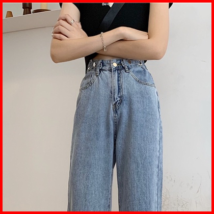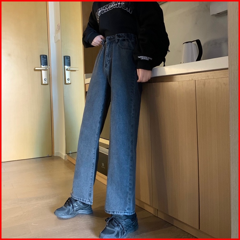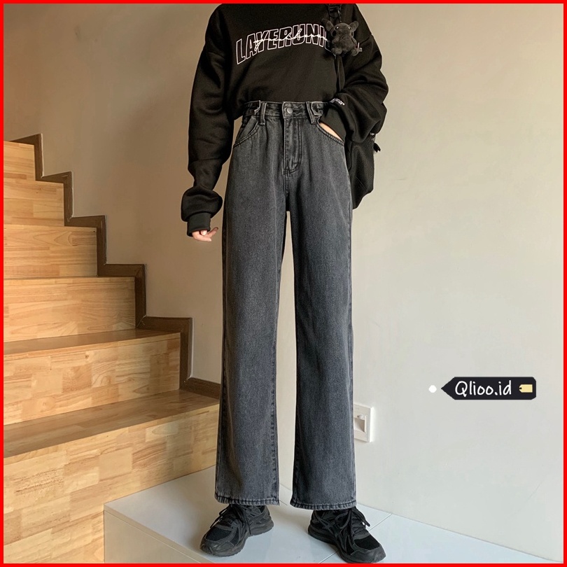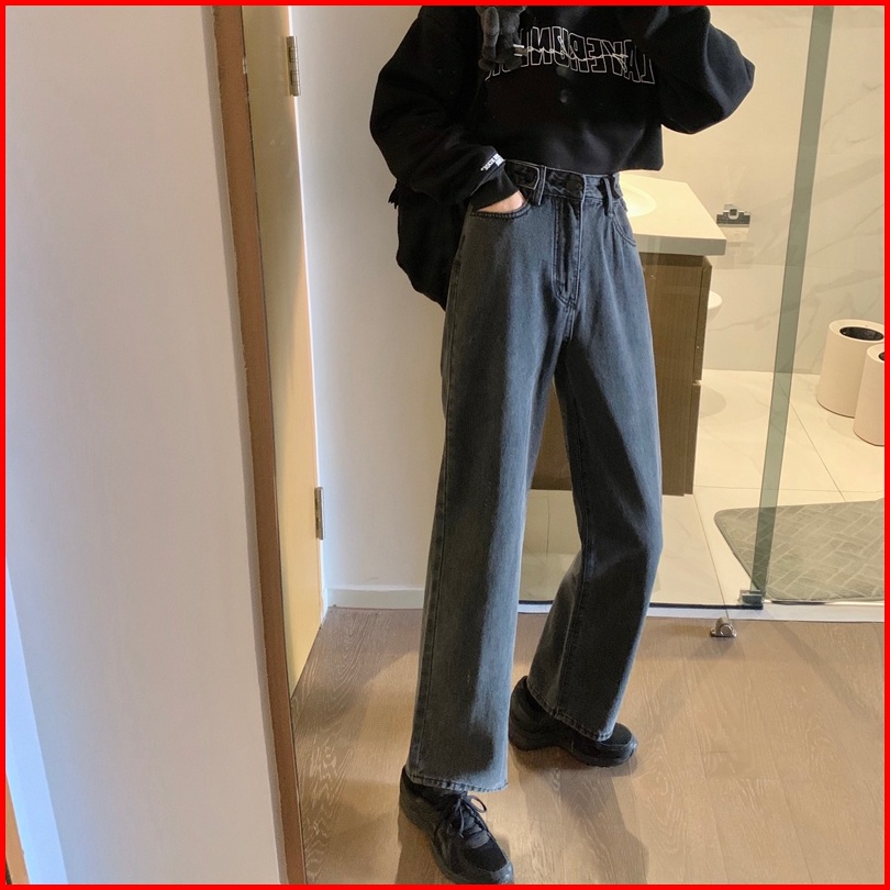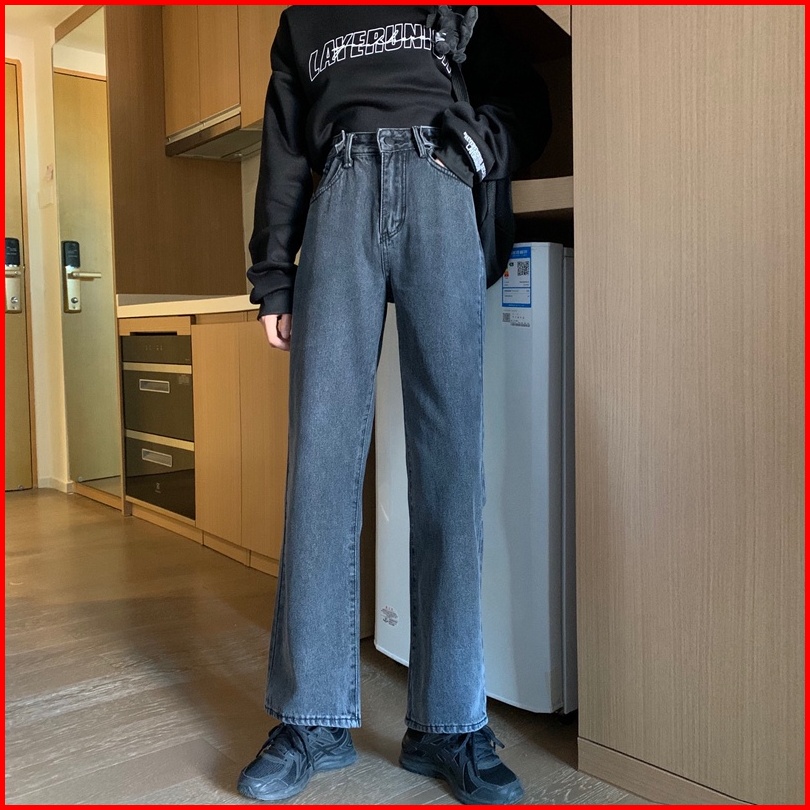 Celana Jeans Hitam Abu-abu Wanita High Waist Straight Pants Korean Style