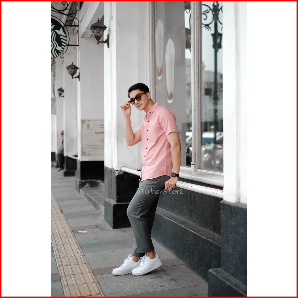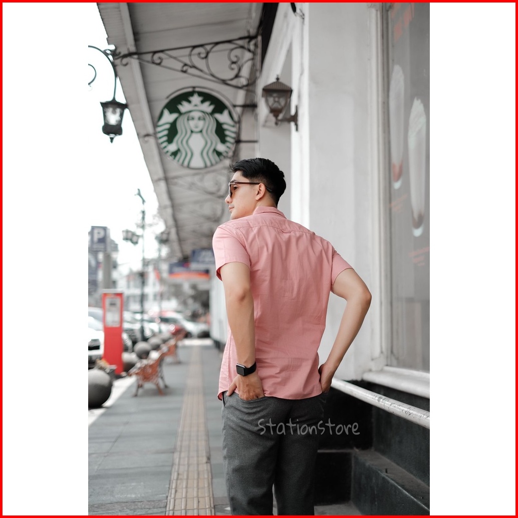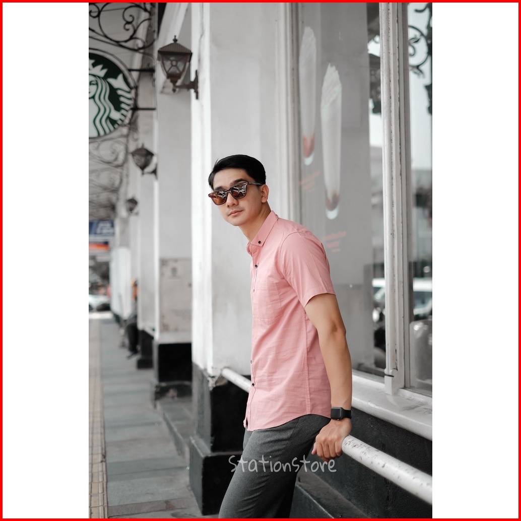 Kemeja Pria Slim Fit Polos Lengan Pendek Warna Peach