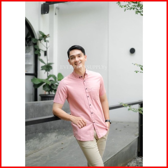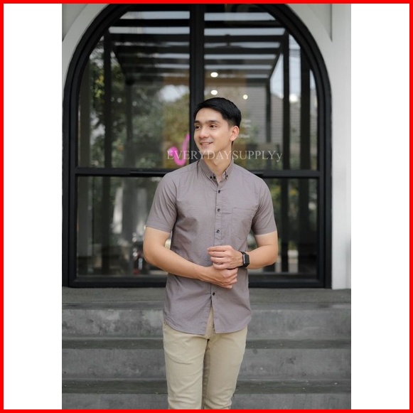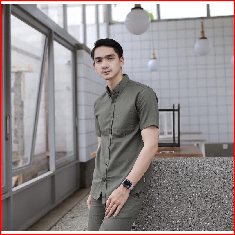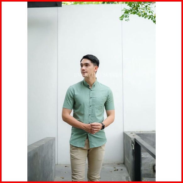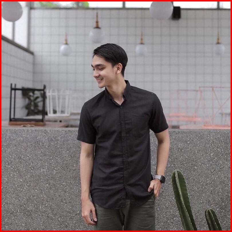 Kemeja Polos Pria Lengan Pendek Slimfit Warna Hijau Army Hitam Putih